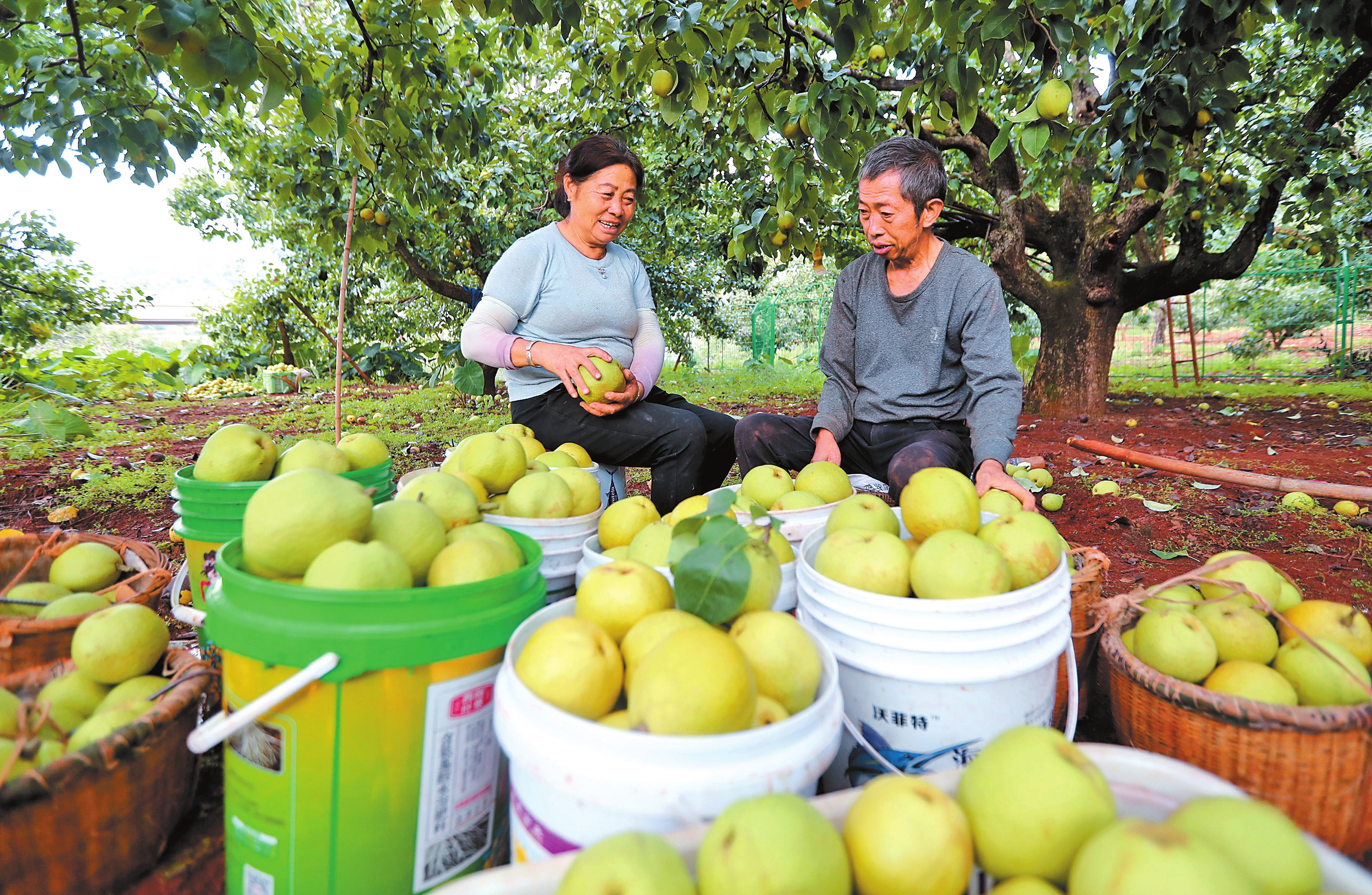 近年来,昆明市呈贡区万溪冲社区推进农文旅深度融合,通过举办宝珠梨赏花、采摘、“梨树王”评选、“梨王”争霸赛等丰富的活动,带动乡村旅游蓬勃发展,提升宝珠梨文化旅游品牌影响力。2013年以来,呈贡区已举办8届宝珠梨梨花节和采摘节,累计接待游客235万人次,旅游收入1355万元。图为“梨树王”代表杨平家的梨园喜获丰收。见习记者 高吴双 摄