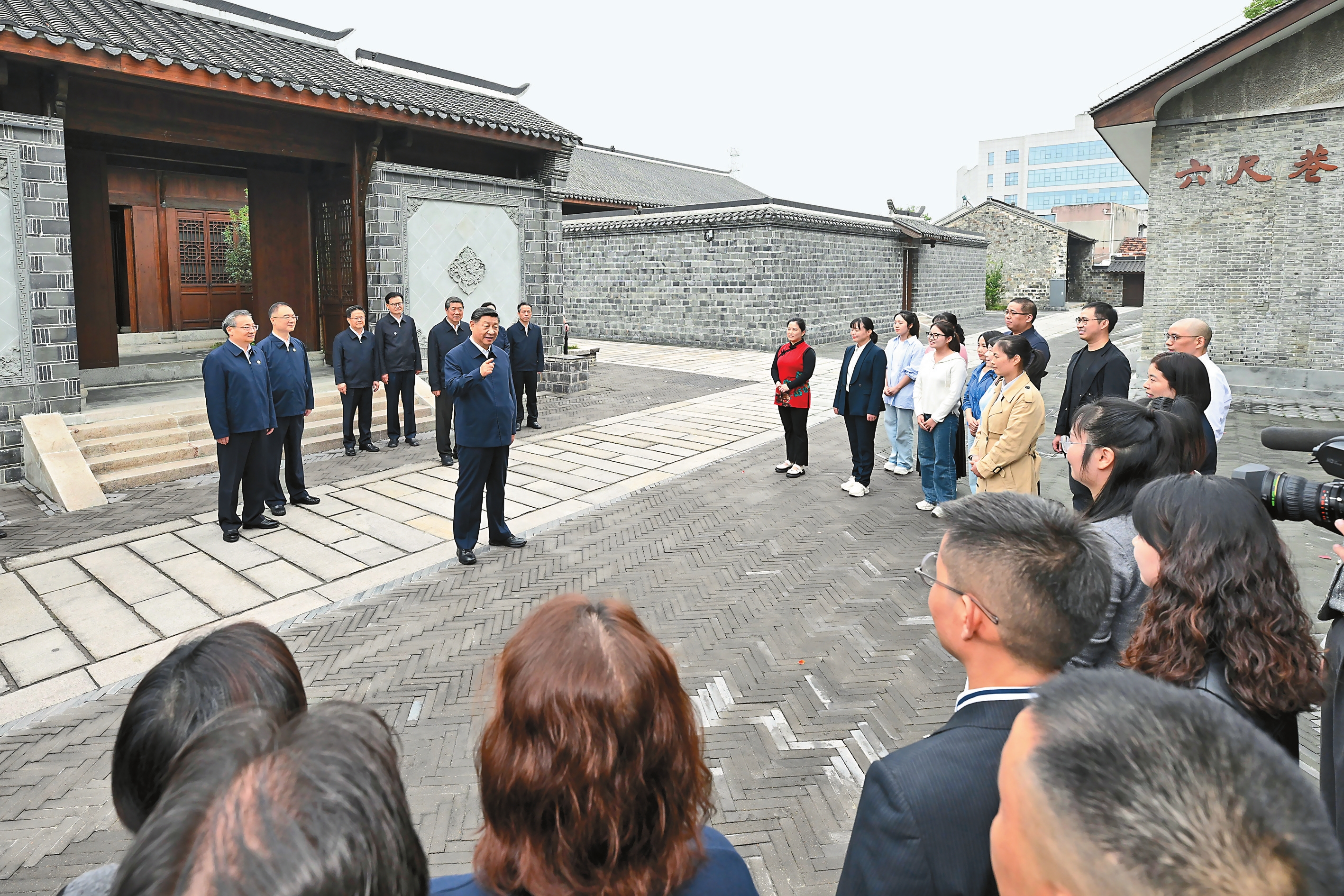10月17日至18日,中共中央总书记、国家主席、中央军委主席习近平在安徽考察。这是17日下午,习近平在安庆桐城市六尺巷考察时,同当地居民和游客亲切交流。新华社记者 申宏 摄