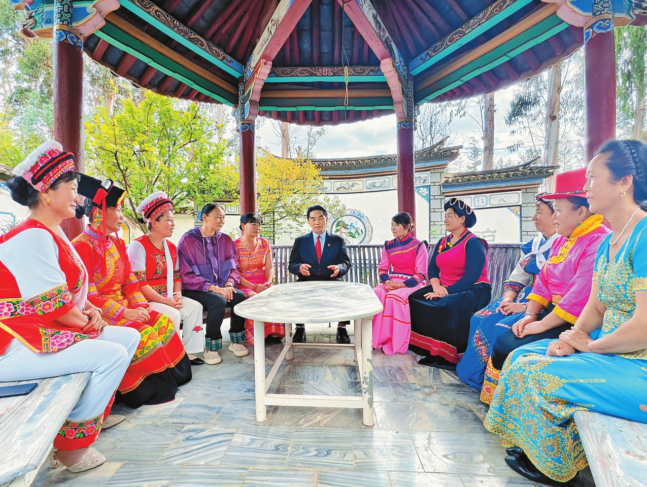 在北京参加完全国民族团结进步表彰大会后,洱源县三营镇共和村村民委员会郑家庄村民小组党支部书记何国祥就忙着赶回到村里,迫不及待地和村民们分享获得“全国民族团结进步模范集体”的喜讯。在郑家庄村同心亭前,穿着民族服装的村民们听着何书记带回的好消息,喜悦之情溢于言表:“我们要继续把民族团结记在心间,带领全村群众共同发展产业、共建美好家园,让民族团结之花越开越艳。”