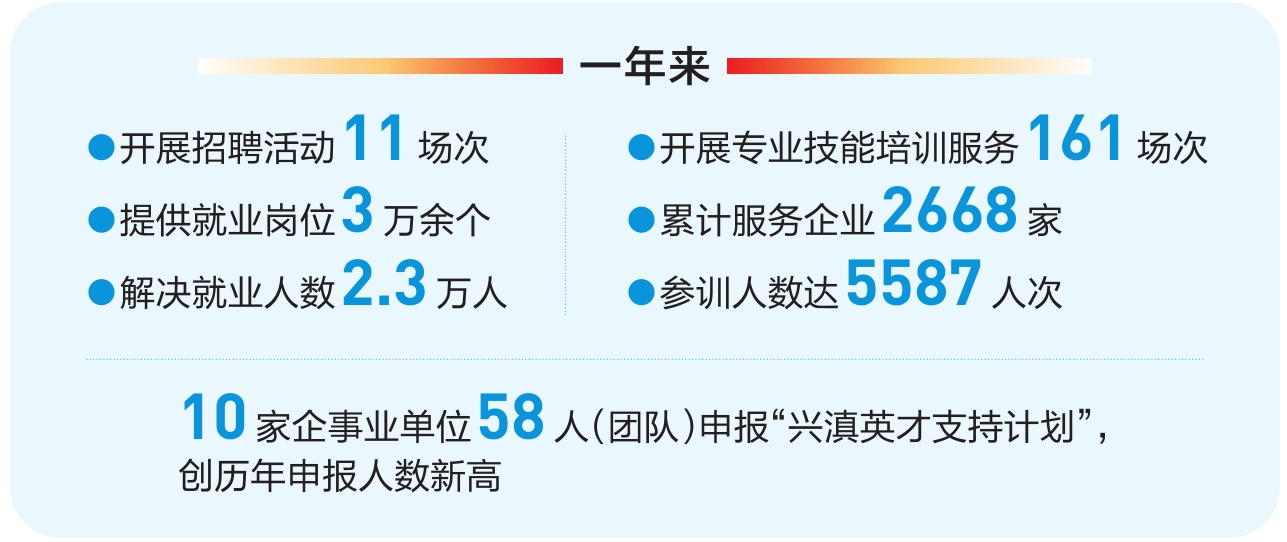 持续拓宽引才渠道,一年来,昆明高新区共组织开展招聘活动11场次,提供就业岗位3万余个,解决就业人数2.3万人。开展专业技能培训服务161场次,累计服务企业2668家,参训人数达5587人次。以“走出去+请进来”帮助企业精准引才。组织园区17家单位参加昆明市2024年度“梦想不远、昆明首选”全国引才活动,高新区13家热门企业占全市28家热门企业数的46%。组织“云南省2024届高校毕业生就业供需对接大会”,与全省52家院校负责人开展了交流座谈,并向各高校积极推介高新区的优质企业。承办北京高校赴云南对接交流访企拓岗活动,为北京大学、清华大学等18所高校提供200余个优质岗位。动员园区用人单位申报各类人才项目,10家企事业单位58人(团队)申报“兴滇英才支持计划”,创历年申报人数新高。通过开展精准化引才育才服务,为想干事、能干事的人才提供创新创业全要素专业辅导。