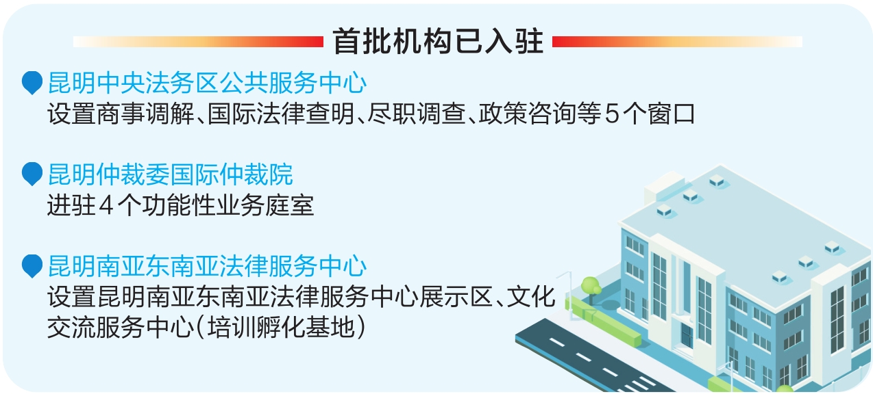 目前,首批入驻昆明中央法务区的机构包括昆明中央法务区公共服务中心,设置商事调解、国际法律查明、尽职调查、政策咨询等5个窗口;昆明仲裁委国际仲裁院进驻4个功能性业务庭室;昆明南亚东南亚法律服务中心,设置昆明南亚东南亚法律服务中心展示区和文化交流服务中心(培训孵化基地)。此外,昆明中央商务区管理委员会正在推进省国合中心、省贸促会的入驻事宜,其中省国合中心将设置南亚东南亚地区国际安保联盟、南亚东南亚投资权益维护中心、南亚东南亚安全生产和应急管理国际合作中心;省贸促会将设置商法服务专区、国际商会专区。