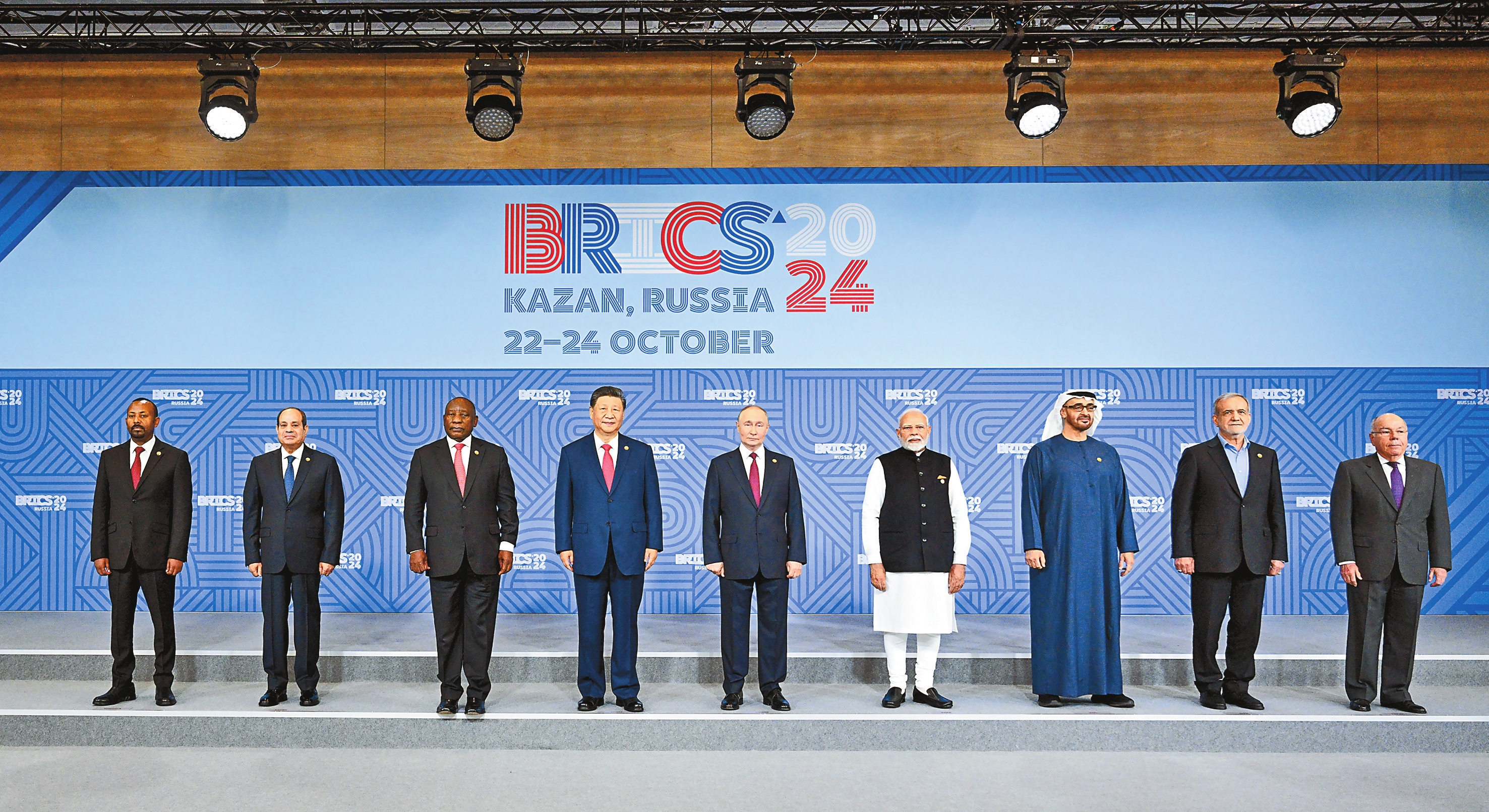 当地时间10月23日上午,金砖国家领导人第十六次会晤在喀山会展中心举行。俄罗斯总统普京主持会晤。中国国家主席习近平、巴西总统卢拉(线上)、埃及总统塞西、埃塞俄比亚总理阿比、印度总理莫迪、伊朗总统佩泽希齐扬、南非总统拉马福萨、阿联酋总统穆罕默德等出席。这是会晤期间,金砖国家领导人集体合影。 新华社记者 李学仁 摄