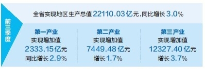 10月23日,省统计局、国家统计局云南调查总队发布数据显示:前三季度全省实现地区生产总值22110.03亿元,同比增长3.0%。其中,第一产业实现增加值2333.15亿元,同比增长2.9%;第二产业实现增加值7449.48亿元,增长1.7%;第三产业实现增加值12327.40亿元,增长3.7%。全省经济承压增长,运行总体平稳。