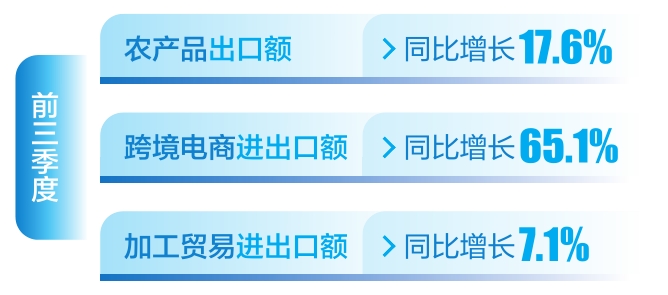 外贸方式、外贸产品新动能不断增强。前三季度跨境电商、加工贸易进出口额分别同比增长65.1%、7.1%。高附加值产品笔记本电脑、手机以及电动载人汽车、锂离子蓄电池等“新三样”出口保持高速增长。