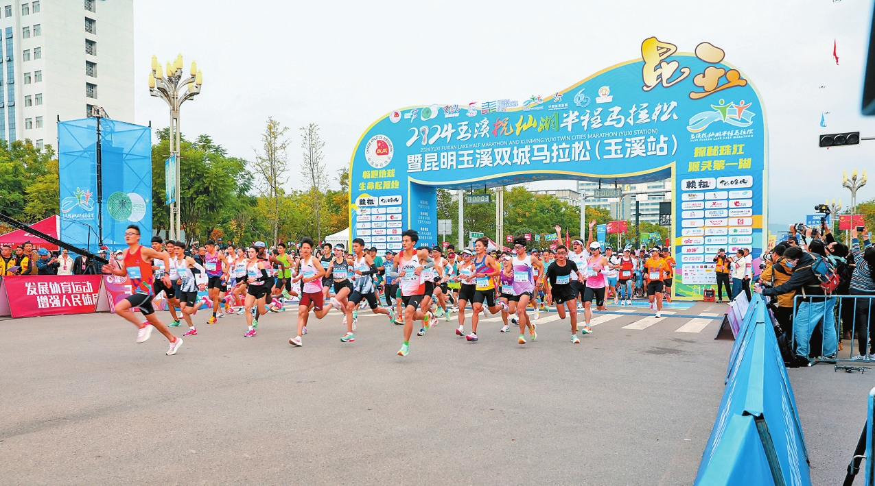 本报讯(记者 杨茜) 11月3日,2024玉溪抚仙湖半程马拉松暨昆明玉溪双城马拉松(玉溪站)在澄江市鸣枪起跑,来自全国各地的万余名跑友参加。