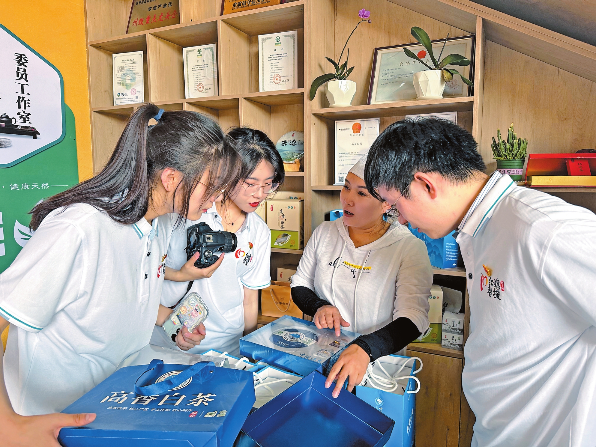 围绕助农增收,绿春县与博士团深度合作,成立中国海洋大学绿春实践基地,开展电商业务培训、乡土人才培养、电商带货扶持等。搭建“博士智援”线上微店,先后为12家绿春企业开通电商渠道,手把手教绿春企业运营微店、直播带货,为绿春“土特产”插上电商“翅膀”。博士团成员化身“电商主播”,根据自身专业和新媒体优势,组织参与进出口商品交易会、南博会等直播48场次,精心挖掘品牌故事、撰写直播文案、布置直播场景,成功将红米线、玛玉茶、铁皮石斛等10余种“土特产”推广至全国各地,线上销售农产品达192万元、直播点赞量超130余万次、“线上+线下”直播效益带动3.7万群众增收。