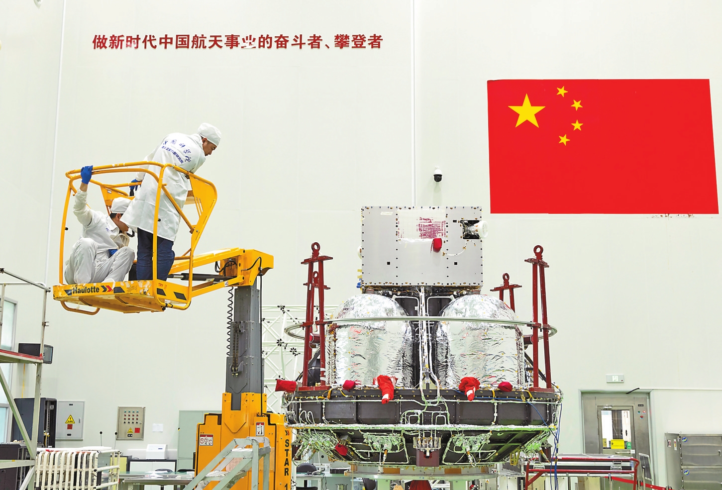 “微笑”卫星工程是中国首次与欧洲空间局进行任务级全方位深度合作的空间科学探测任务,也是中国科学院空间科学(二期)先导专项收官之作。图为11月4日,在位于上海的中国科学院微小卫星创新研究院总装厂房,科研人员对“微笑”卫星进行最后的检查。
