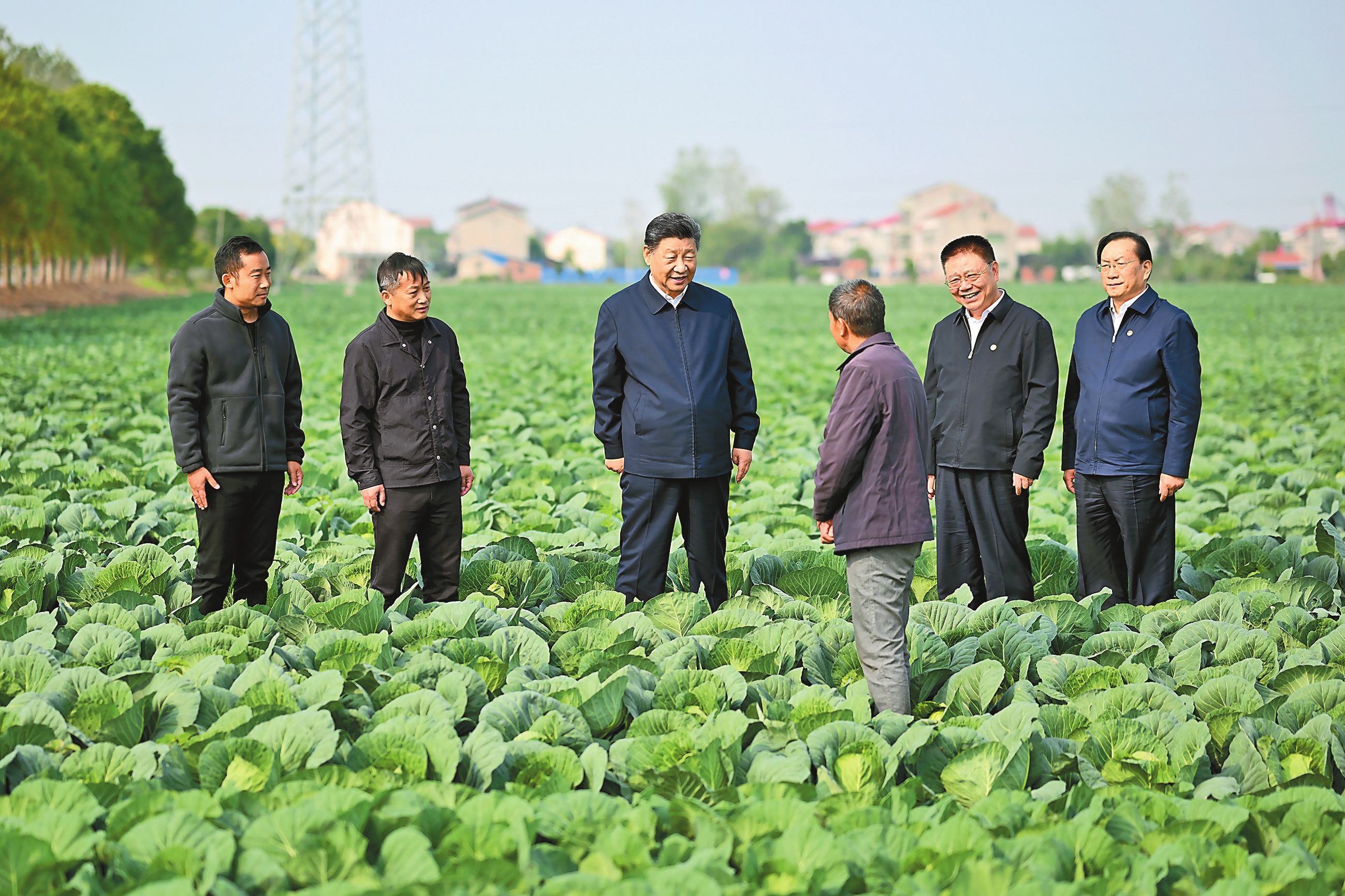 5日上午,习近平前往咸宁市嘉鱼县,首先到潘家湾镇十里蔬菜长廊考察。深秋时节,这里仍然满目青翠、生机勃勃。习近平走进田间,察看蔬菜长势,详细询问蔬菜品种、种植技术、销售等情况。他强调,农村天地广阔,农业大有可为。发展现代农业,建设农业强国,必须依靠科技进步,让科技为农业现代化插上腾飞的翅膀。他勉励当地干部群众走科技之路、质量之路、品牌之路,把蔬菜种植这个富民产业进一步做好,让更多群众增收致富。