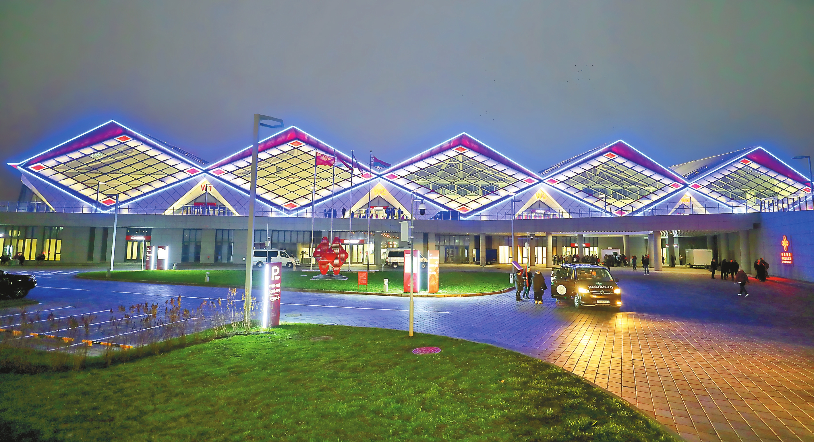 图为11月6日在白俄罗斯明斯克拍摄的中国援建的白俄罗斯国际标准游泳馆外景。