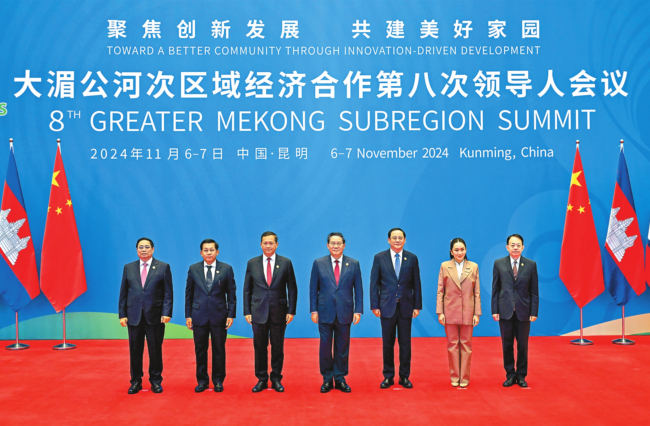 11月7日,国务院总理李强在昆明出席大湄公河次区域经济合作第八次领导人会议。这是李强同出席会议的柬埔寨、老挝、缅甸、泰国、越南政府首脑和亚洲开发银行行长合影。 新华社记者 殷博古 摄