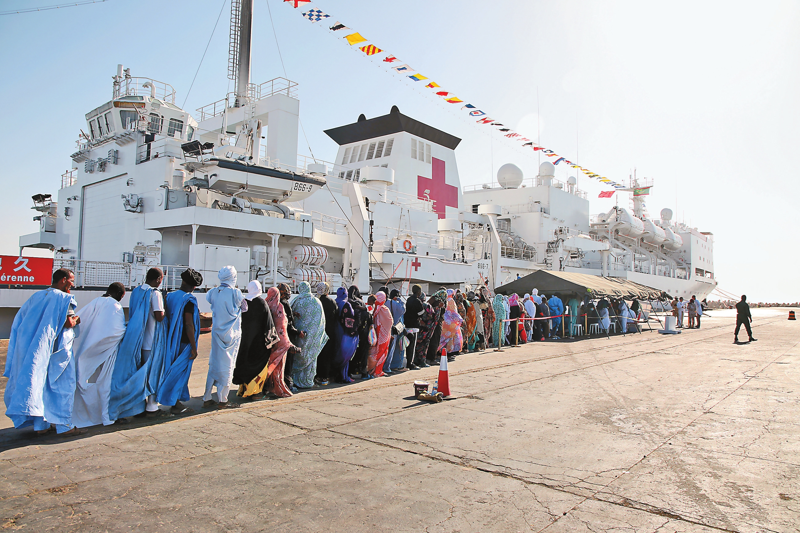 图为11月3日,中国海军“和平方舟”号医院船在毛里塔尼亚首都努瓦克肖特开展医疗服务。新华社发
