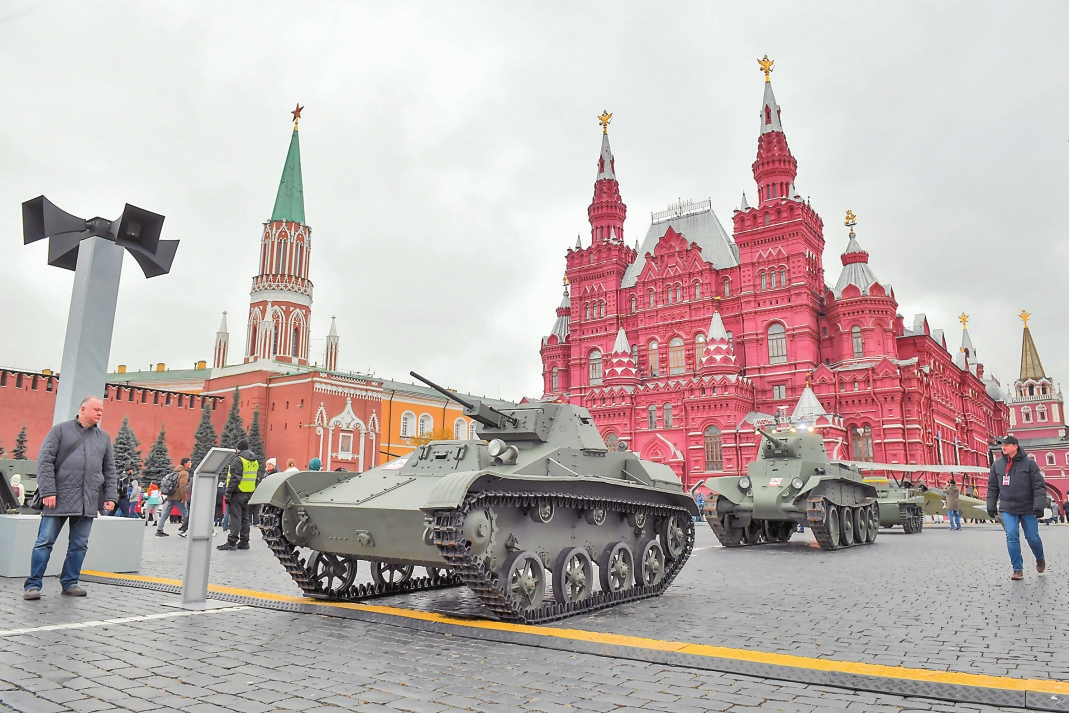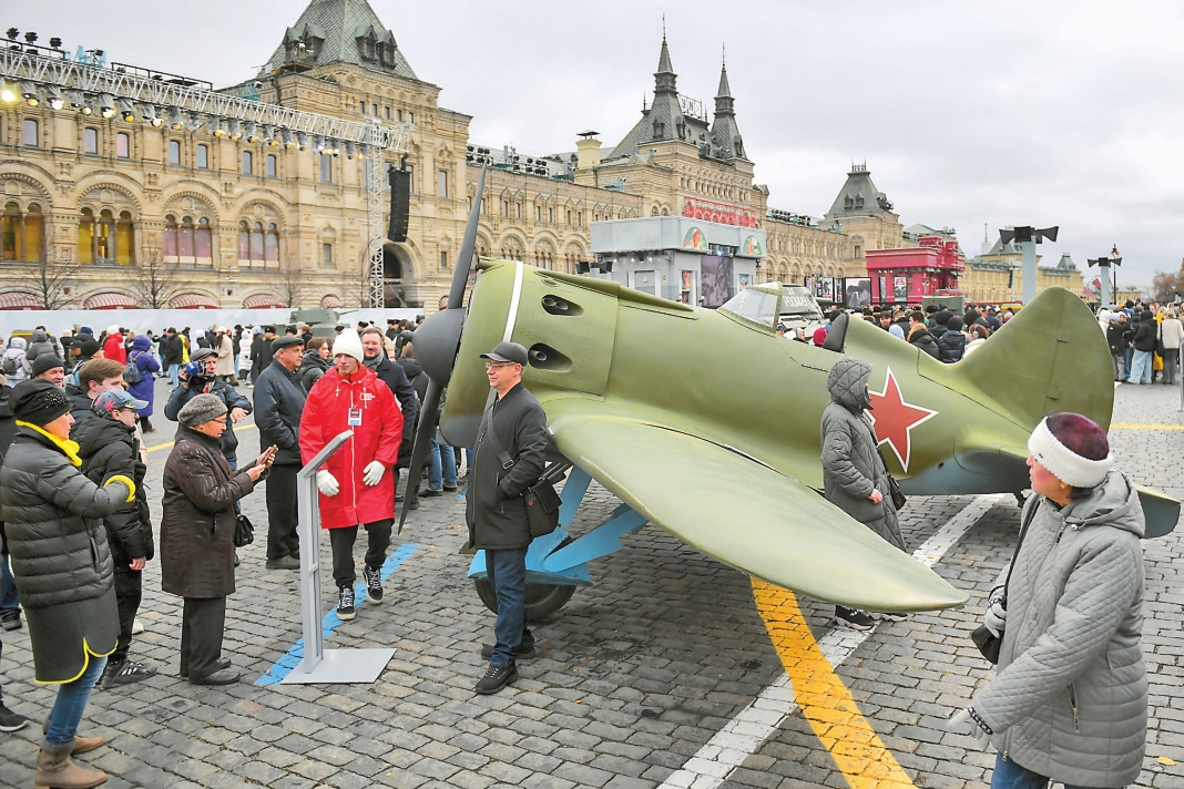 11月7日,俄罗斯在红场举行露天展览,纪念1941年苏联红场阅兵式。图为当日,在俄罗斯首都莫斯科,人们参观以纪念1941年苏联红场阅兵式为主题的露天展览。 新华社发