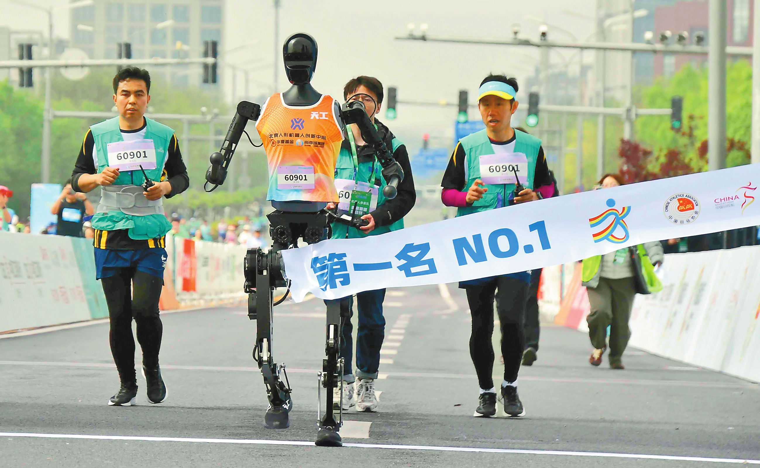 新华社北京4月19日电(记者 张骁 李春宇) 备受关注的世界首次“人机共跑”半程马拉松赛事19日在京完赛。来自北京人形机器人创新中心的“天工队”以2小时40分42秒的成绩摘得冠军,“松延动力小顽童队”和“行者二号队”分获亚军、季军。