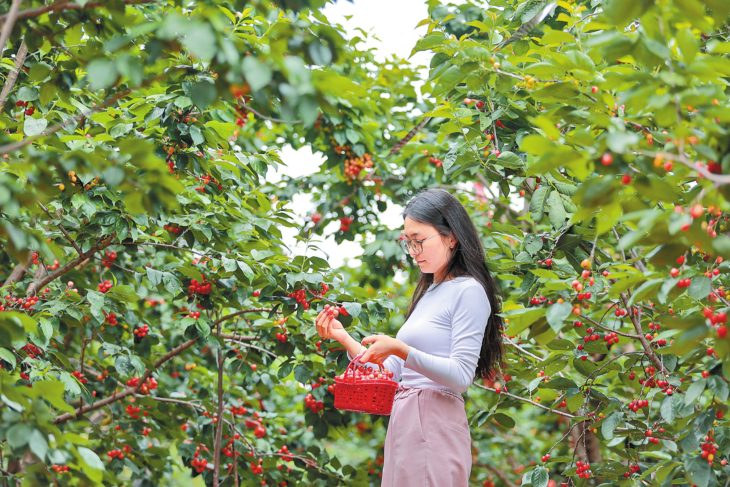 上图为市民在果园内采摘樱桃。
