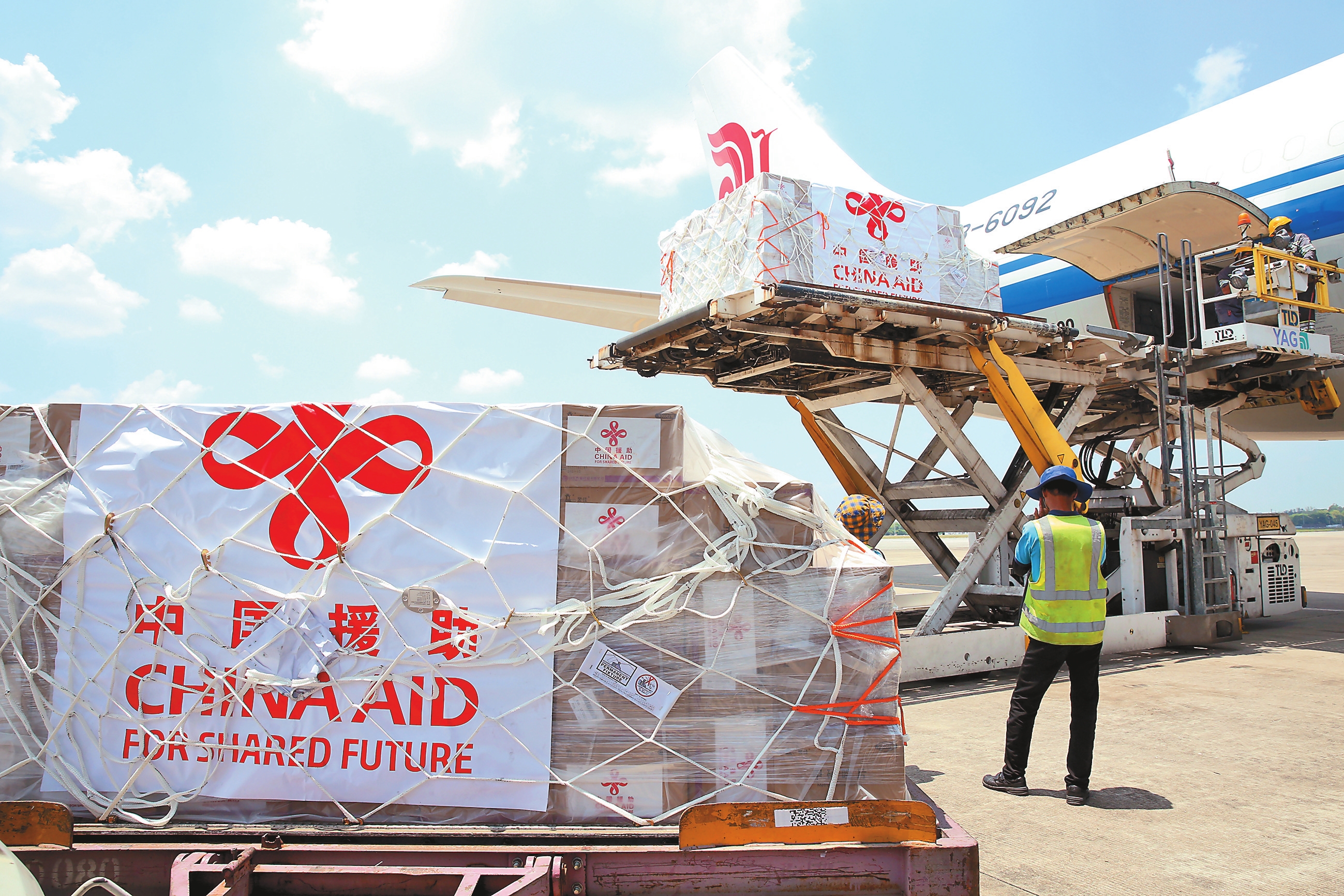 图为地震救灾援助物资抵达缅甸仰光国际机场。新华社发 苗觉梭 摄