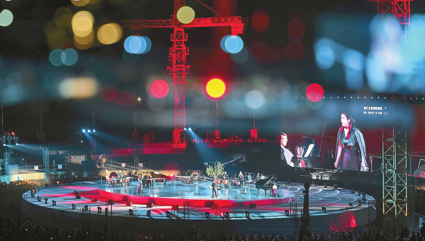 暮色四合,夕月初上。景迈茶马古窖建设工地临时搭建的舞台中央,国际著名指挥家、作曲家谭盾联袂纽约打击乐团和杨丽萍团队舞者,以千年茶山为幕、山风成谱,首演《“景迈山魂·万国茶会”谭盾音乐会》。音乐会融合经典打击乐、歌剧、舞剧、舞蹈、音乐等多种艺术形式,由“树”—《春之祭》,“鹿”—《九色鹿》,“人”—《茶马古道》三个篇章组成,音画交响激活东方哲思,奏响文明交融促进“珍爱地球 人与自然和谐共生”的永恒主题。