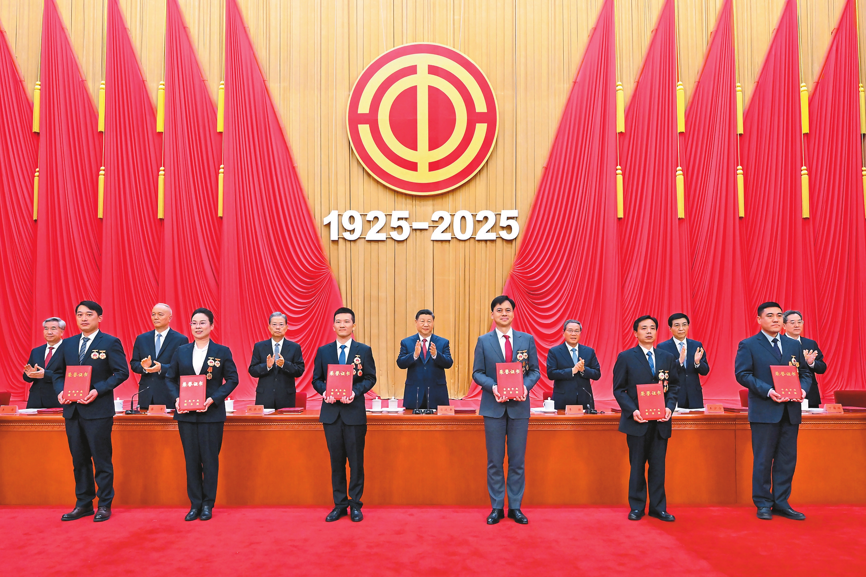 人民大会堂大礼堂气氛隆重热烈。主席台上方悬挂着“庆祝中华全国总工会成立100周年暨全国劳动模范和先进工作者表彰大会”会标,后幕正中悬挂中国工会会徽,会徽下方是“1925—2025”字标,10面红旗分列两侧。二楼眺台悬挂着标语:“以习近平新时代中国特色社会主义思想为指导,坚定不移听党话跟党走,在以中国式现代化全面推进强国建设、民族复兴伟业中充分发挥工人阶级主力军作用和工会桥梁纽带作用!”