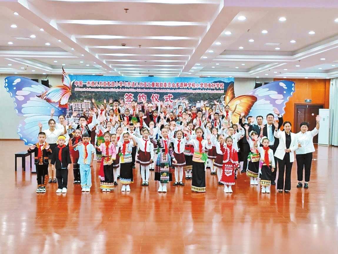 本报讯(记者 韩成圆) 2025年是中国和赤道几内亚建交55周年。4月29日,中国—赤道几内亚友谊小学与赤道几内亚儿童救助委员会多语种学校小学部友好交流活动以线上形式举办。活动在赤道几内亚首都马拉博市、中国云南省昆明市及红河哈尼族彝族自治州金平苗族瑶族傣族自治县设3个分会场,两国青少年“云端”相聚,共话友谊。