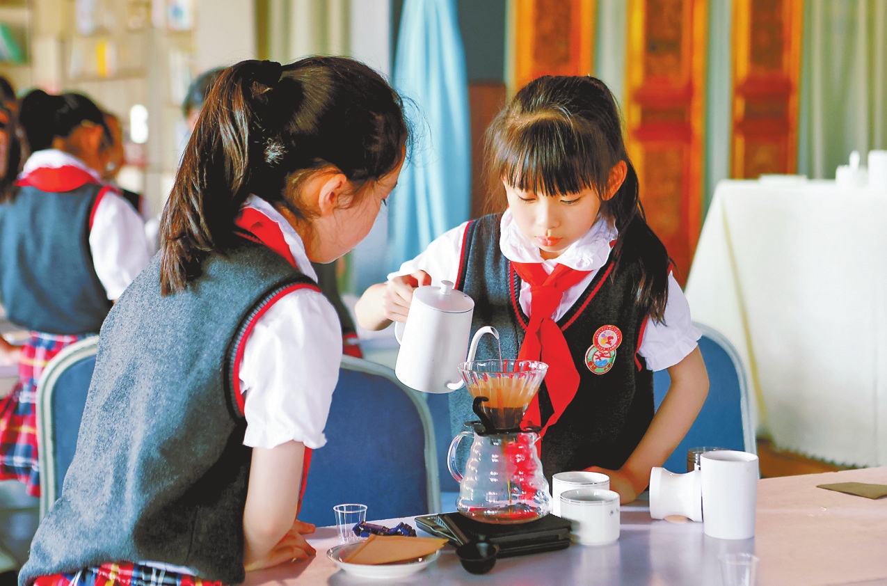 “五一”假期,一场别开生面的茶咖文化体验活动在普洱市展开。昆明市五华区春城小学师生与春城小学小雷锋志愿服务队走进普洱漫崖咖啡庄园与普洱华煜茶厂,以劳动实践探寻非遗技艺,在茶香与咖啡香中感悟传统文化的深厚底蕴。图为学生们体验手冲咖啡制作。本报记者 高吴双 摄