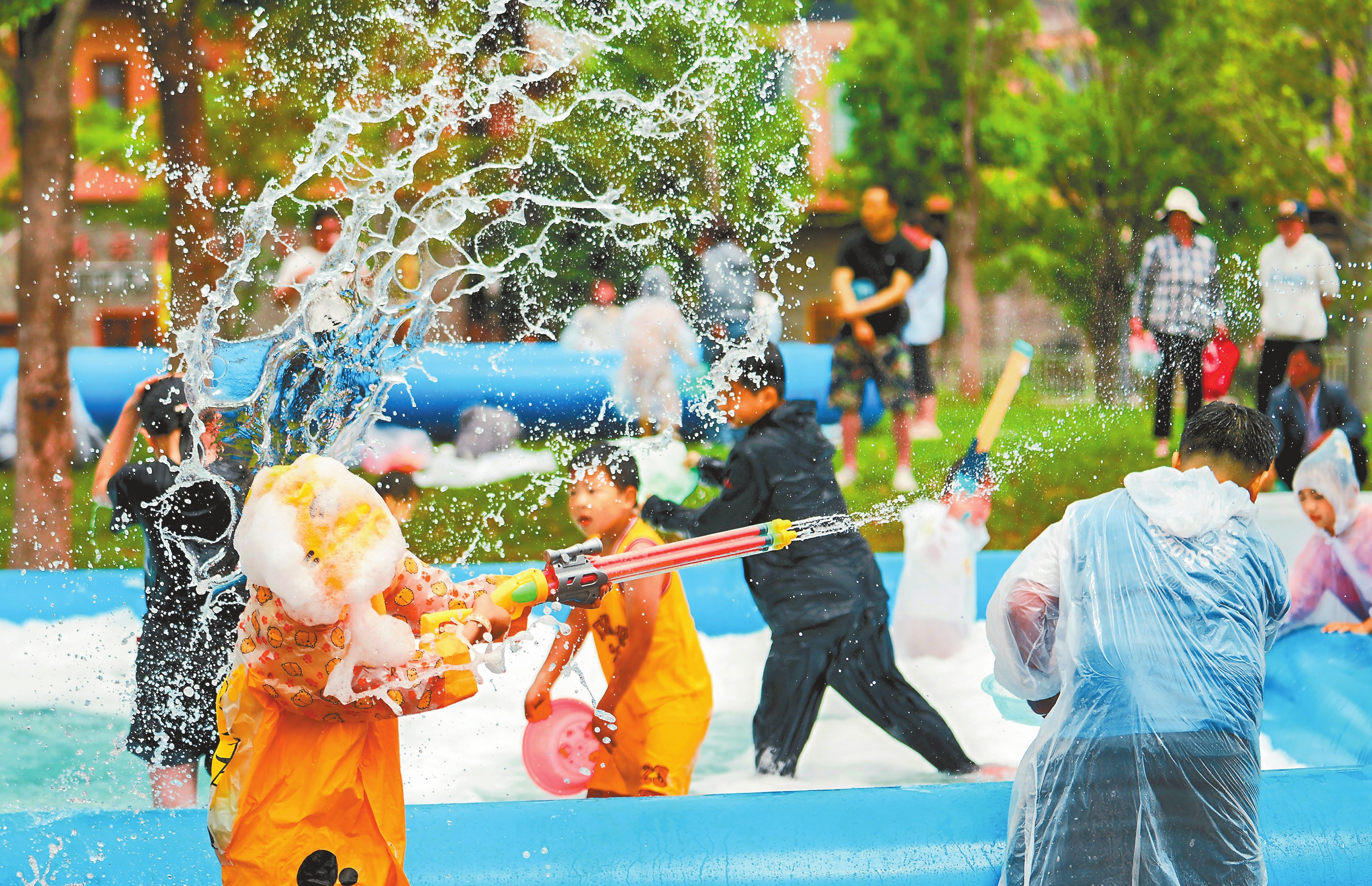 “五一”假期,40多万游客到融创滇池后海感受边寨赶摆。非遗代表性传承人表演的傣族神话神鸟舞、少数民族服装服饰博物馆“半见私服”定制、3'TAO 三水寿、水上民族舞剧《云水傣梦》、风情泼水节返场、星光傣迪……游客们欢快地沉浸在“边境寨子”。图为泼水节活动。 本报记者 王毅 摄
