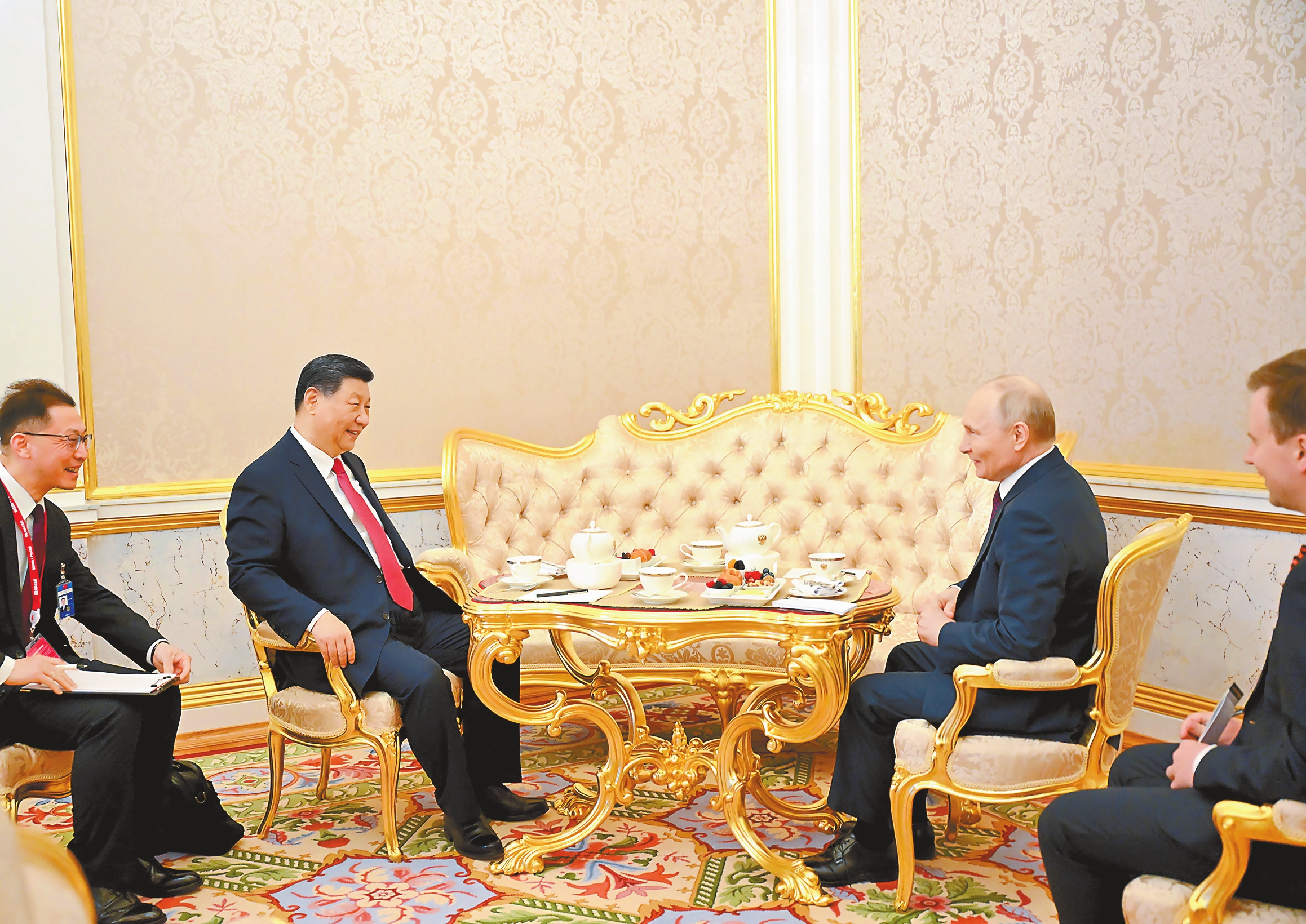 当地时间五月八日下午,俄罗斯总统普京同中国国家主席习近平在莫斯科克里姆林宫总统办公室进行茶叙。新华社记者 谢环驰 摄