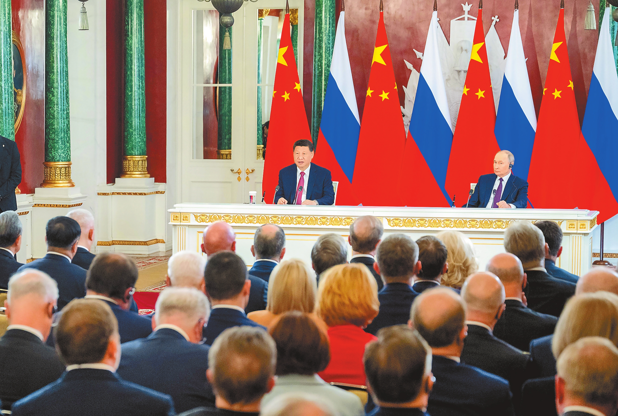 要坚持和衷共济,做全球治理的引领者。世界前途命运应该由各国共同掌握,全球发展成果应该由各国共同分享。中俄同为世界大国和重要新兴市场国家,都肩负着推动全球治理向更加公正合理方向发展的崇高使命。双方要加强在联合国、上海合作组织、金砖国家等多边平台的协作,坚守真正的多边主义,引领全球治理正确方向,推动普惠包容的经济全球化。