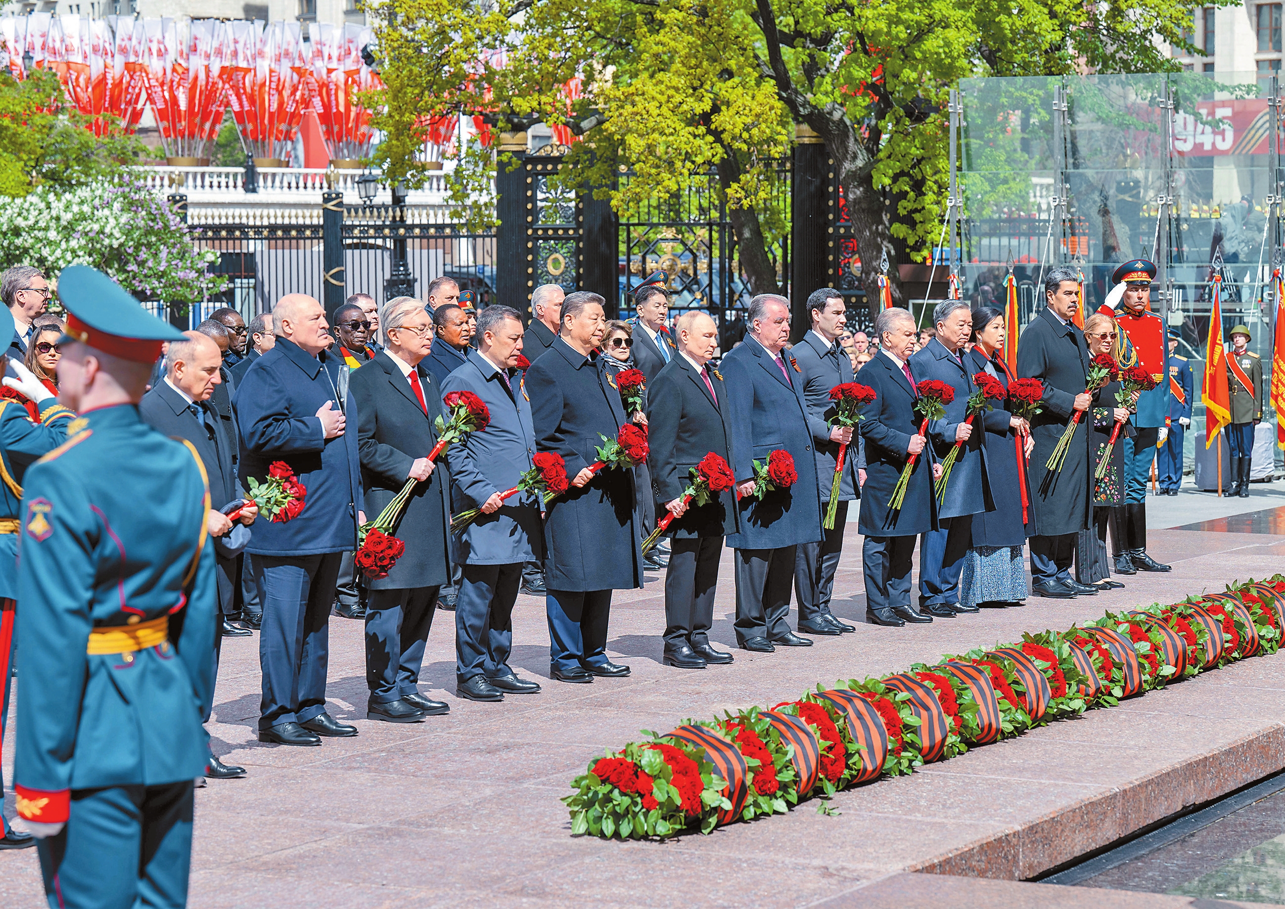 当地时间5月9日,俄罗斯举行盛大庆典,纪念苏联伟大卫国战争胜利80周年。国家主席习近平和来自世界20多个国家及国际组织领导人应邀出席庆典。庆典结束后,习近平同其他国家领导人一起从红场来到亚历山大花园,向无名烈士墓献花,并肃立默哀。 新华社记者 翟健岚 摄