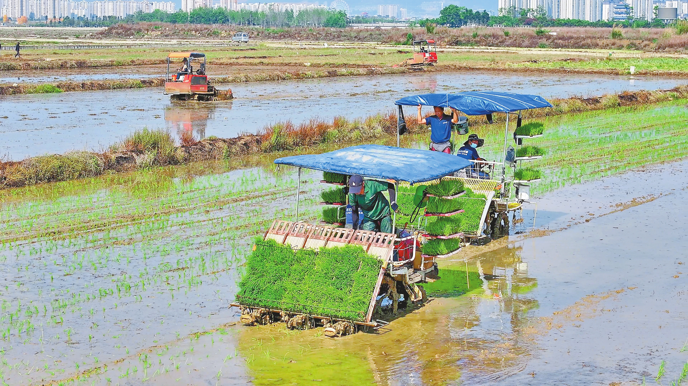 走进“一座保山”稷穗农业水稻种植基地,田垄间多台农机有序穿梭,宛如训练有素的“插秧能手”,将嫩绿的秧苗精准插入水田。稻田上空,搭载着高精度喷洒系统的无人机轻盈掠过。通过智能控制系统,操作人员在地面就能设定好飞行路线、喷洒高度和用量,以均匀的速度和合适的角度将肥料均匀播撒,确保每一寸土地都能“吃”到肥料。