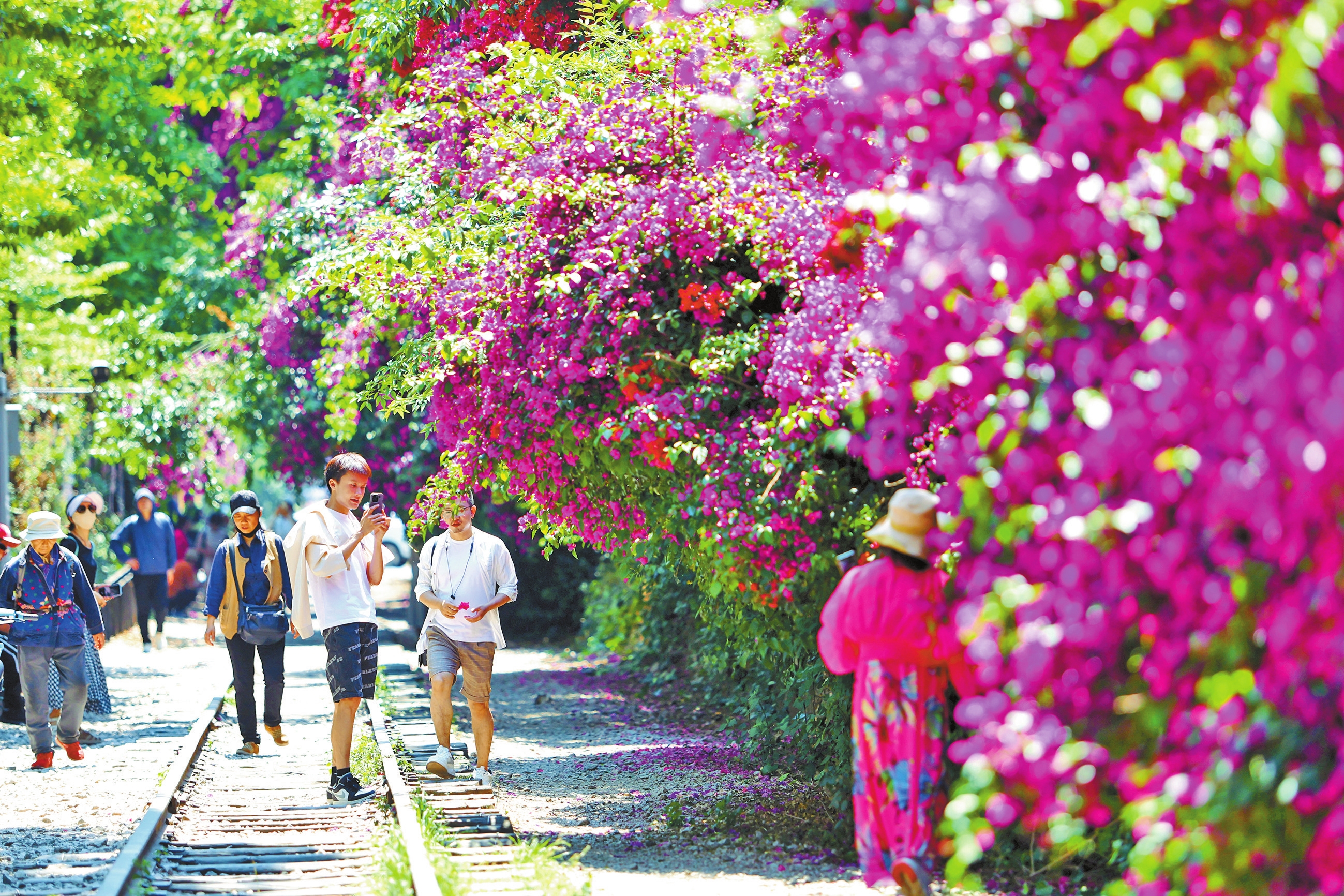 5月,昆明市五华区地台寺铁路两侧的三角梅绚烂绽放。在米轨铁路旁、街巷转角处,火红的花瀑与周围景物相映成趣,构成了一幅充满诗意的城市画卷。