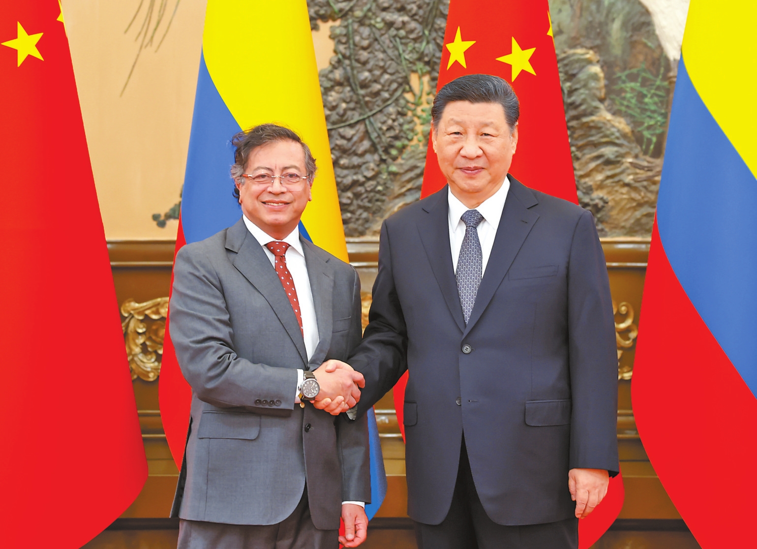 佩特罗表示,哥伦比亚与中国的友好关系源远流长,哥方期待深入发展对华关系。双方要深化政治互信,加强相互支持。共建“一带一路”,拓展贸易、基础设施、新能源、人工智能等领域合作,改善人民生活。当前,国际局势复杂多变,个别国家唯利是图的做法不利于世界,各国应团结应对。哥方愿同中方密切配合,捍卫国际公平正义,维护发展中国家共同利益。