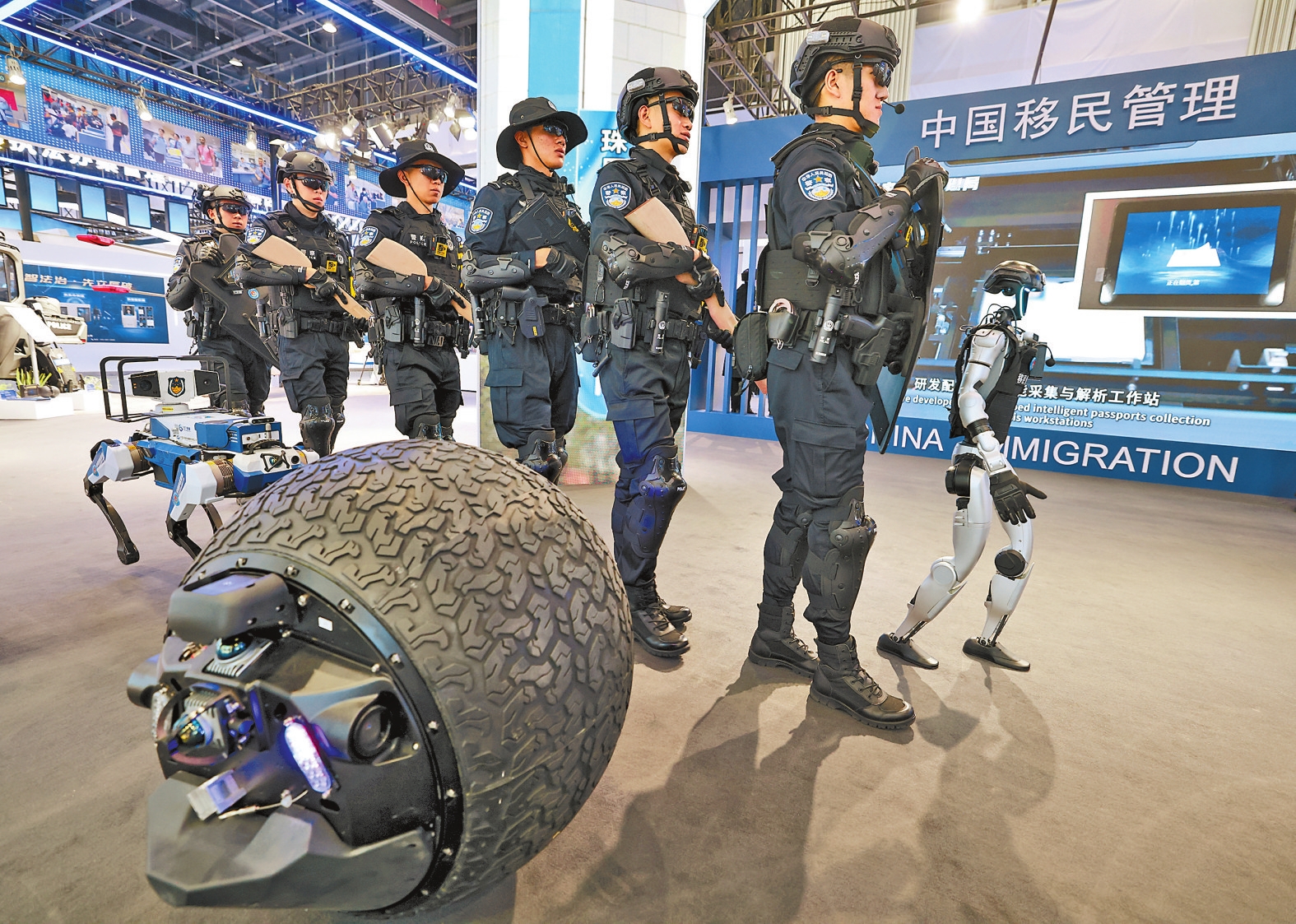 5月14日,由公安部主办的第十二届中国国际警用装备博览会在北京首钢国际会展中心开幕。本届警博会以“新技术、新装备、新质战斗力”为主题,以“简约、专业、精彩”为办展理念,广泛邀请国内外警用装备企业和科研机构参展,展示新技术在警用装备上的最新应用,展现警用技术装备发展成就。本届警博会为期4天,展区总面积6.4万平方米,规模创历史新高,共有来自12个国家和地区的835家企业参展。图为在博览会移民管理装备展区,民警和球形机器人、警用机器狗和具身人形智能警务机器人(右一)一起进行巡逻演练。新华社记者 殷刚 摄