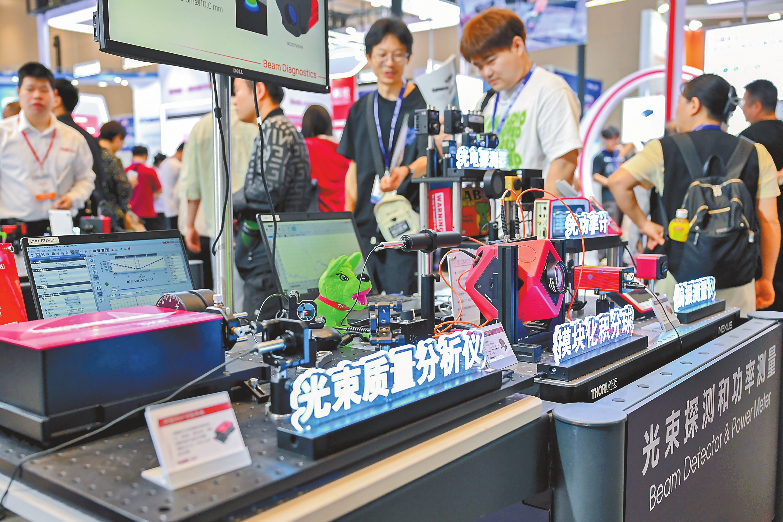 5月16日,第二十届“中国光谷”国际光电子博览会在武汉中国光谷科技会展中心开幕。本届光博会以“光联万物,智引未来”为主题,来自光电子领域国内外多家知名企业参展。展会设置激光技术与应用、光学与精密光学、“光+机器人”等展区,多角度展现“光+智能应用”的产业热点。图为观众在光博会上参观光束探测和功率测量设备。 新华社记者 杜子璇 摄