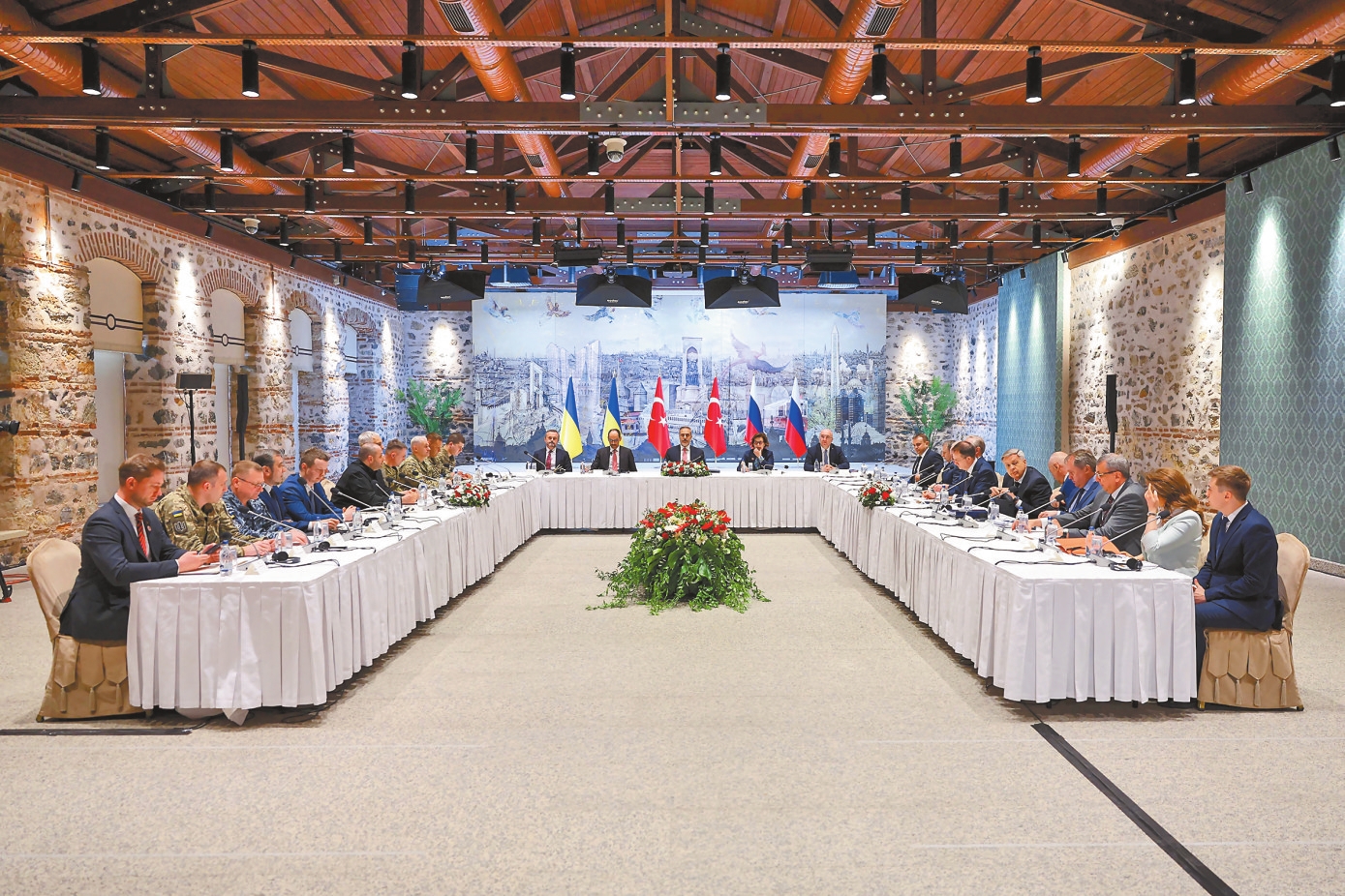 此次俄乌谈判由土耳其外交部长费丹主持,在伊斯坦布尔多尔玛巴赫切宫总统办公室举行。俄方代表团由俄总统助理梅金斯基担任团长,成员包括俄副外长加卢津、俄武装力量总参谋部总局局长科斯秋科夫、俄国防部副部长福明等。乌克兰代表团由国防部长乌梅罗夫、外交部第一副部长谢尔盖·基斯利茨亚以及乌情报部门官员等组成。