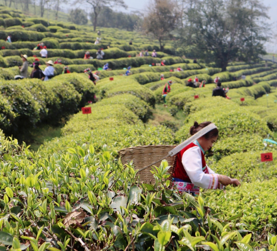 初夏的无量山层峦叠翠,南涧彝族自治县的万亩茶园里,茶农们正背着竹篓穿梭在茶垄间,指尖翻飞采收茶叶,空气中弥漫着阵阵茶香。