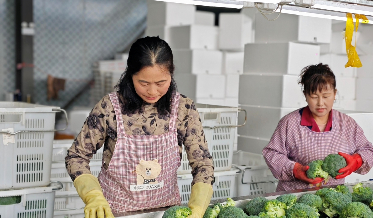 在分选车间,工人们正在流水线上快速完成西蓝花去根、分级作业。“基地每天加工50吨西蓝花,出口的每箱净菜都全程冷链运输确保鲜度。”陈燕明介绍,依托1.2万立方米的冷库,基地的西蓝花实现了错峰销售,产品上市期较其他产区延后20天,完美填补了东南亚市场的空档期。去年,基地共销售西蓝花3600吨,出口的净菜产品备受青睐,单颗最高售价4.6元。