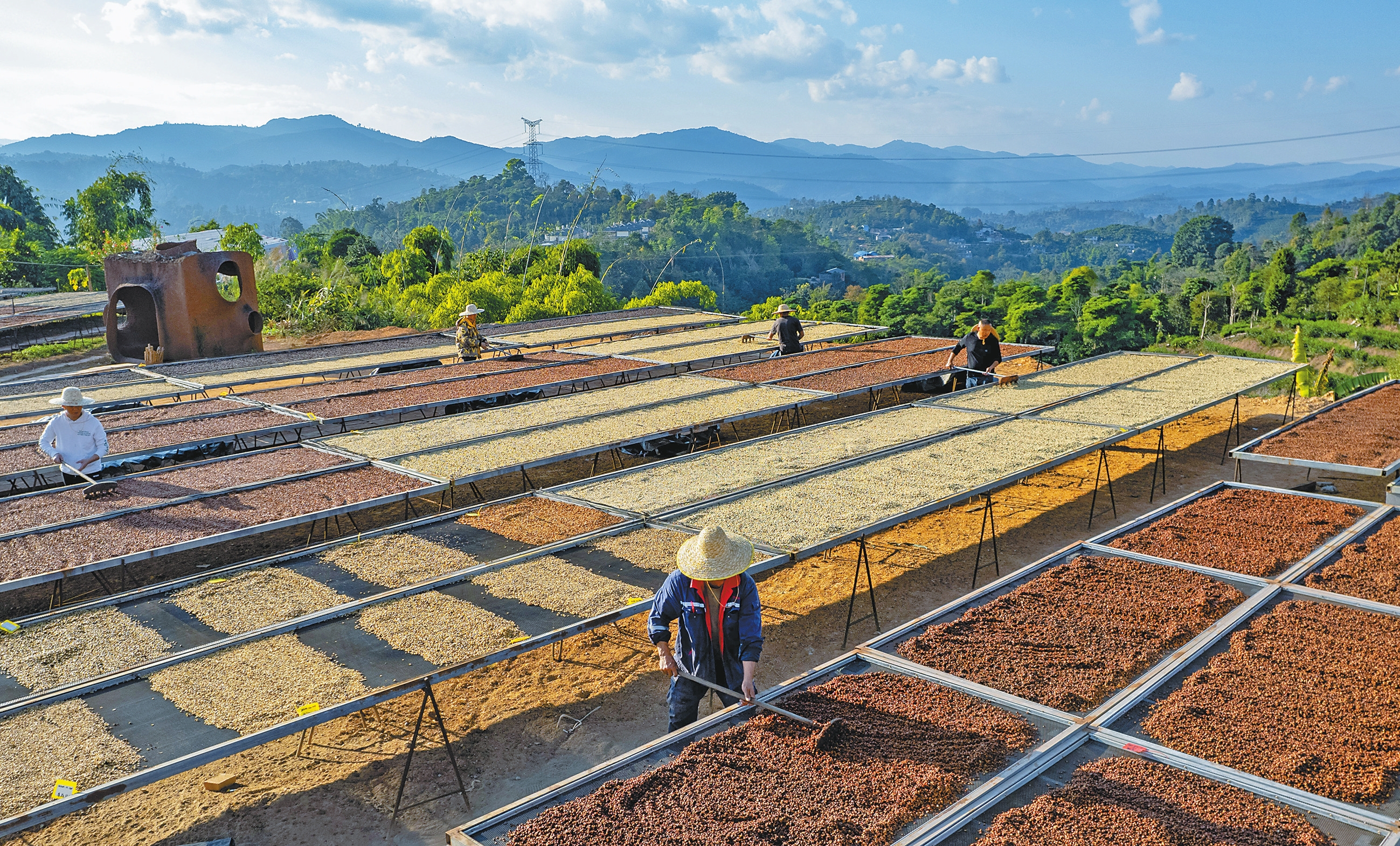 图为工作人员在云南省普洱市思茅区大开河梅子咖啡庄园的咖啡晒场翻晒咖啡(无人机照片,2025年1月7日摄)。