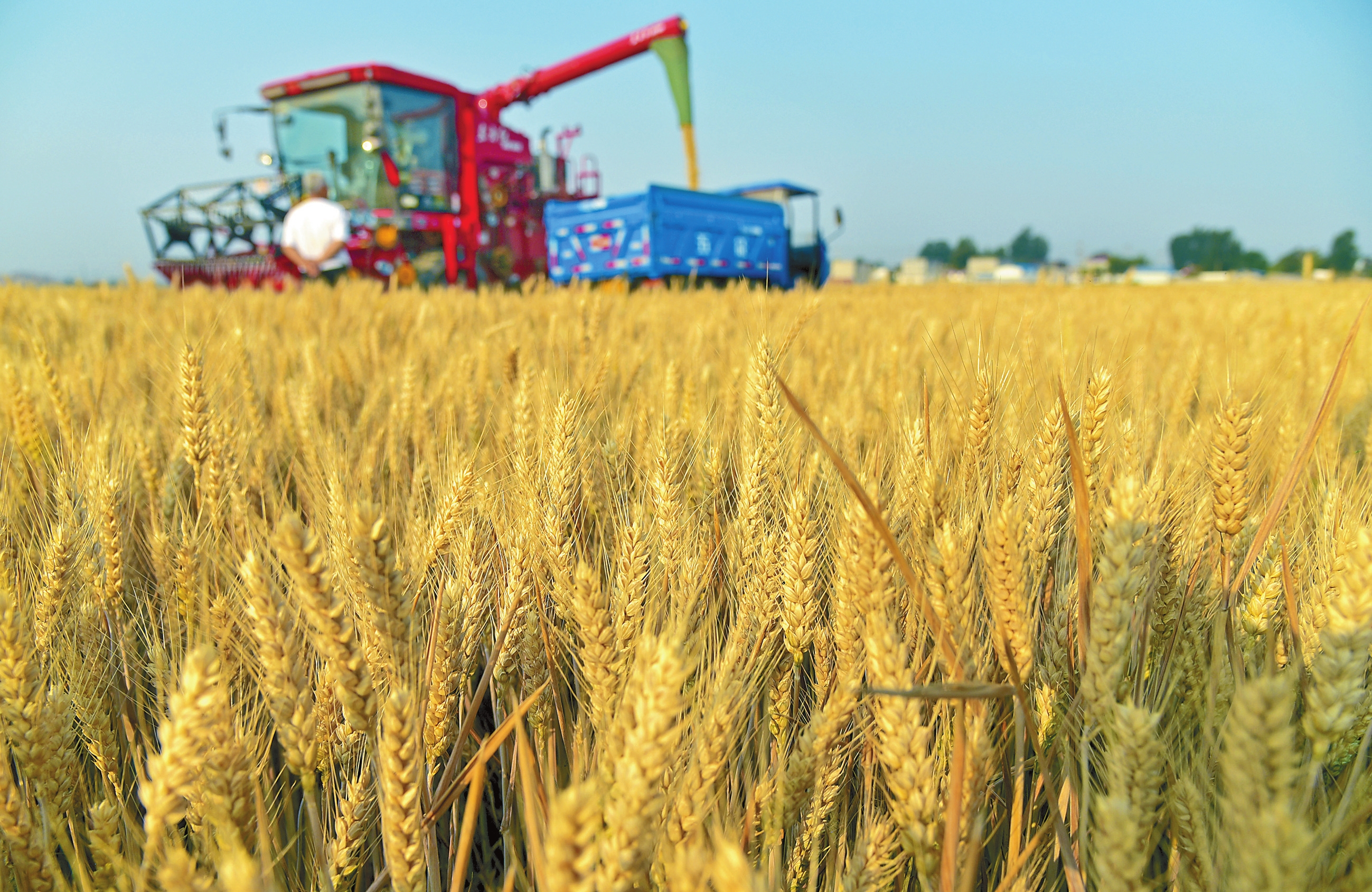 5月27日,山东省枣庄市山亭区城头镇徐洼村农民将收获的小麦装车。记者从农业农村部了解到,截至5月26日17时,各地已收夏粮小麦7005万亩,日机收面积连续3天超过400万亩,全国“三夏”大规模小麦机收全面展开。