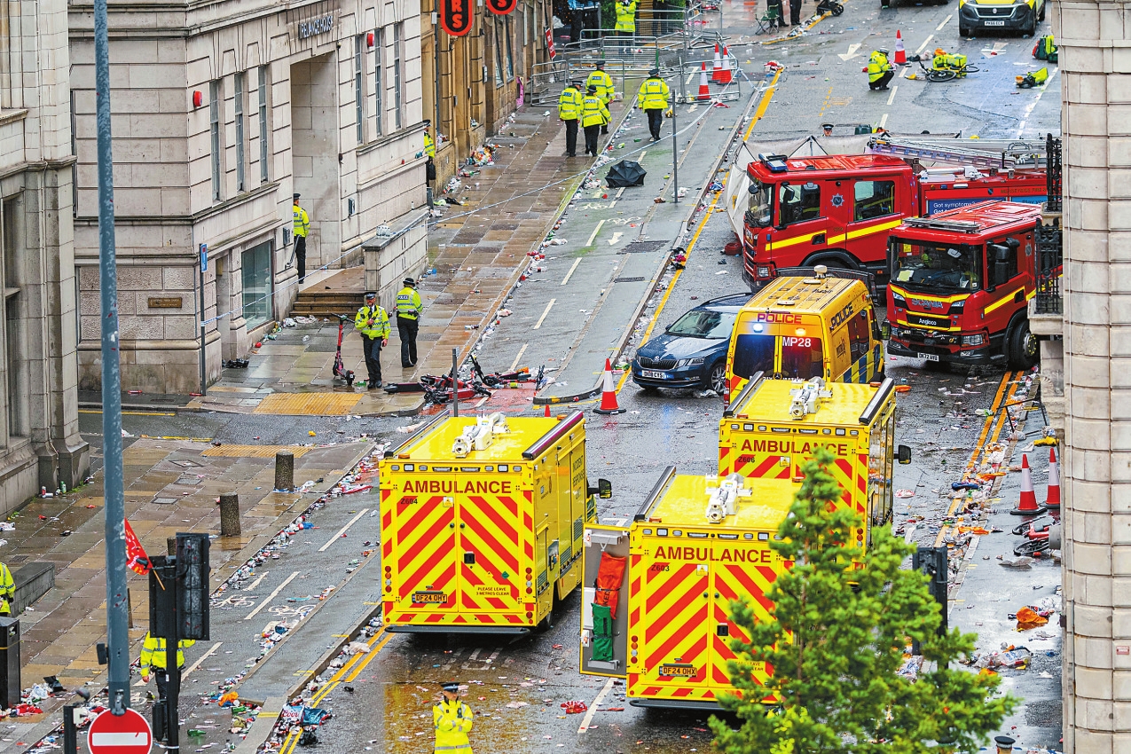 5月26日,警察和应急人员在英国利物浦的驾车撞人事件现场工作。一名53岁英国男子26日驾车径直冲入正在利物浦市中心庆祝利物浦队赢得英超联赛冠军的大批球迷,造成近50人受伤,其中27人送医,两人伤势严重。警方已逮捕嫌疑人,但称汽车冲撞事件与恐怖主义无关。新华社发