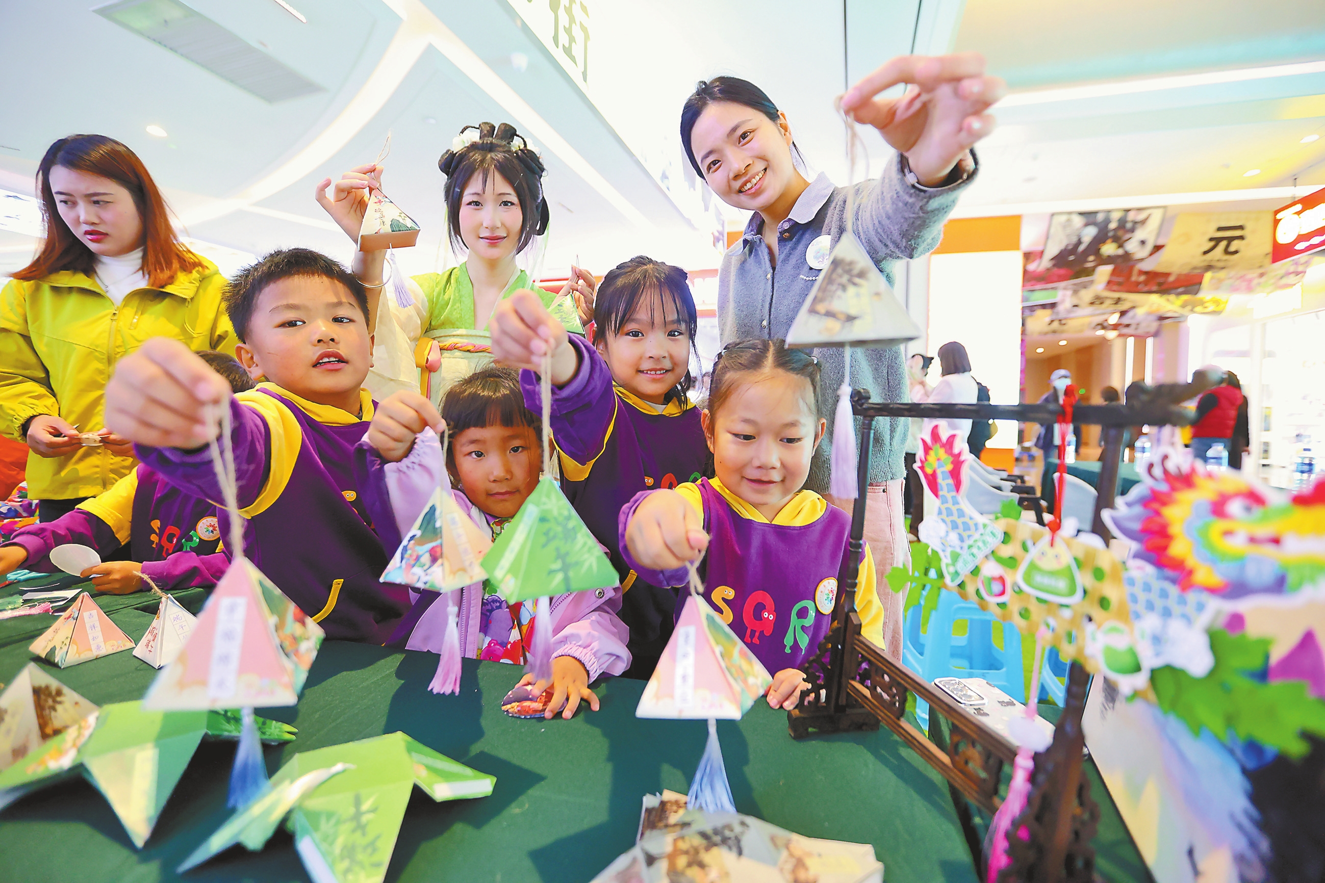 5月27日,昆明市盘龙区东华街道新迎社区一家商超内,社区居民和孩子们共包“文化粽”,在欢声笑语中感受端午节日氛围和中华优秀传统文化的魅力。本报记者 陈飞 通讯员 李薇 摄
