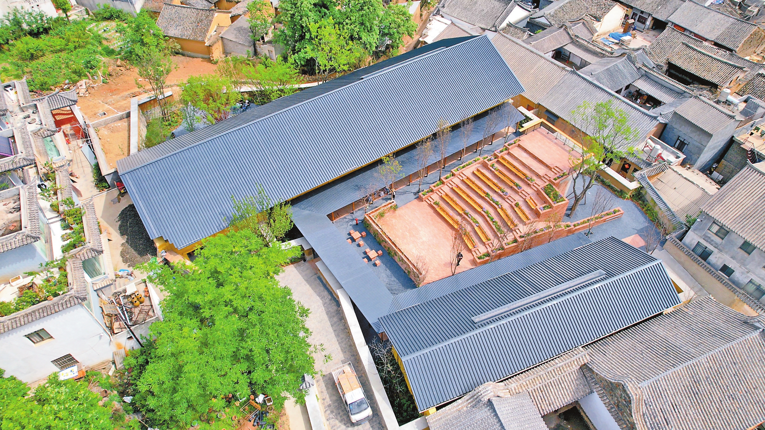 步入白雾书局,在八米书墙背后,一条以竹钢打造的密道通向二楼半开放式阅读区,透过3个金色墙洞,可见坝子尽头绵延的稻田,这种“窥视”设计暗合《爨宝子碑》书法的美学特质。24小时开放的诗歌花园则延续了粮仓广场的公共基因,拾级而上,豁然开朗,白雾坝子尽收眼底。