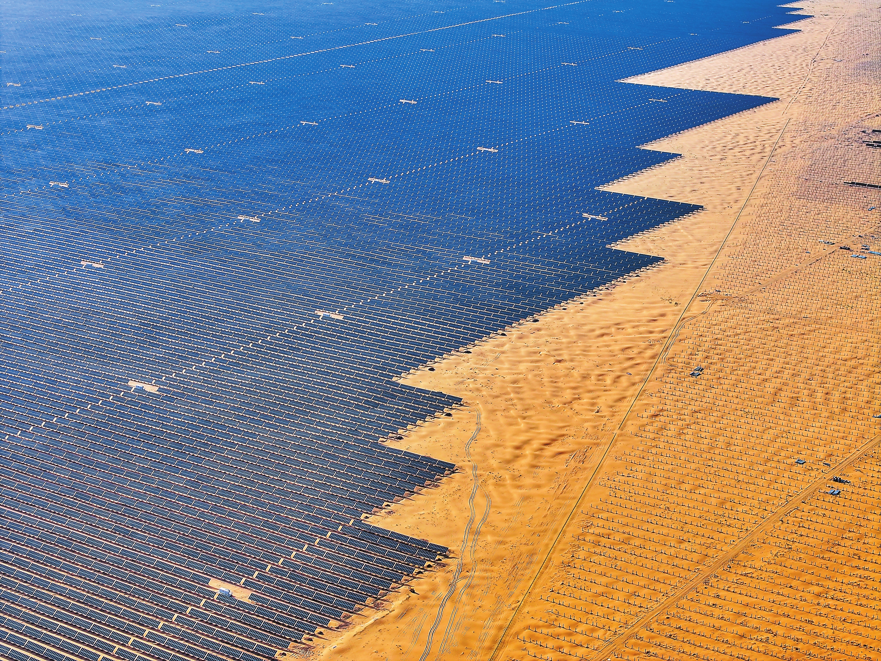 近两年来,内蒙古全力打好黄河“几字弯”攻坚战,累计完成治理面积1489万亩。在库布其沙漠、乌兰布和沙漠,“光伏治沙”模式被广泛运用,沙海中出现了一片片涌动着“绿能”的“蓝海”。图为位于库布其沙漠里的鄂尔多斯市杭锦旗朔方新能源大基地。新华社记者 连振 摄