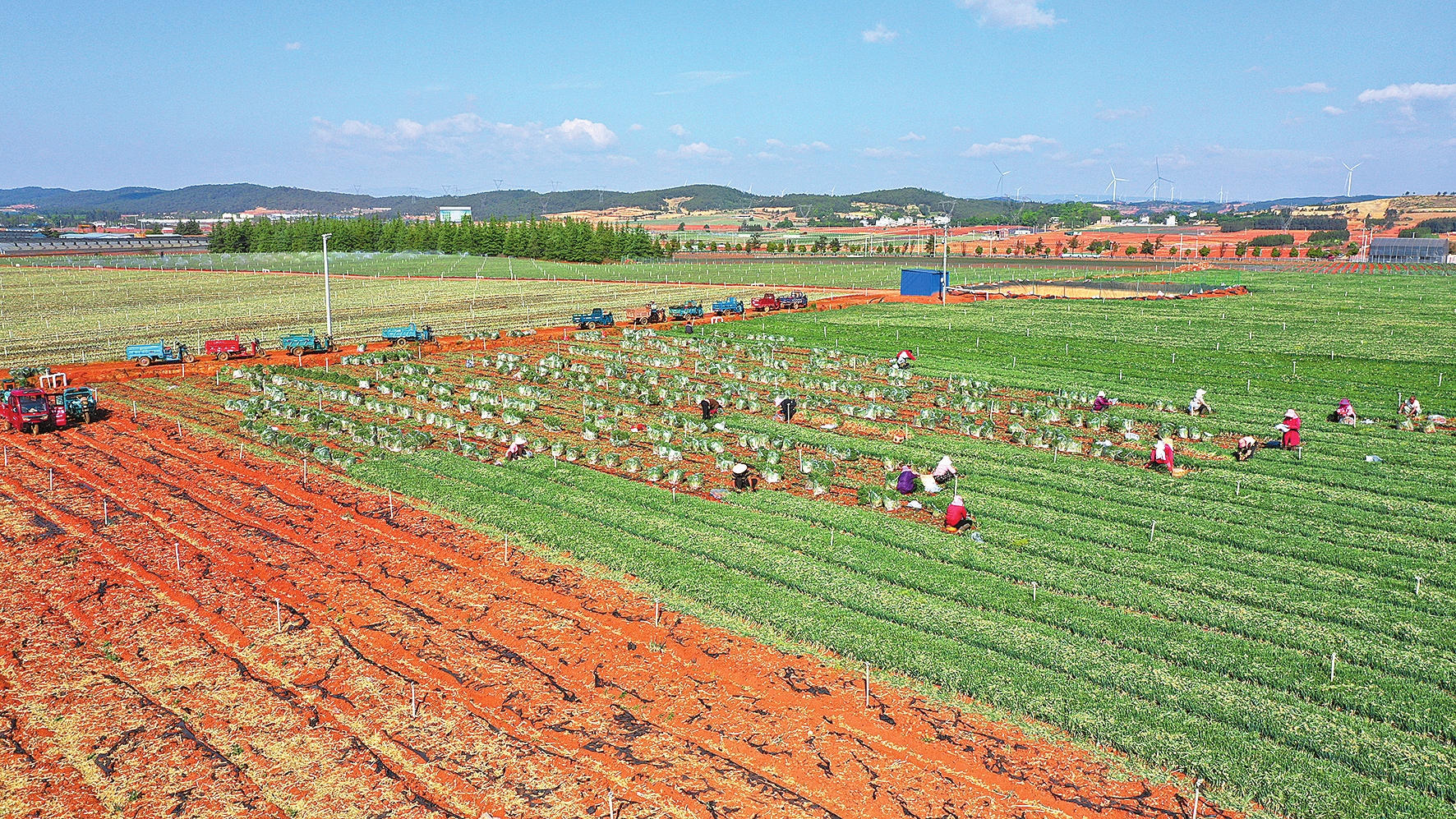在师宗县彩云镇香葱种植基地,翠绿的葱田随风翻涌,现代化喷灌系统画出银色弧线,汉、彝、苗等各族葱农穿梭其间采收、分拣。傍晚时分,乡亲们将香葱装袋排队称重,接过工钱时笑容满面。