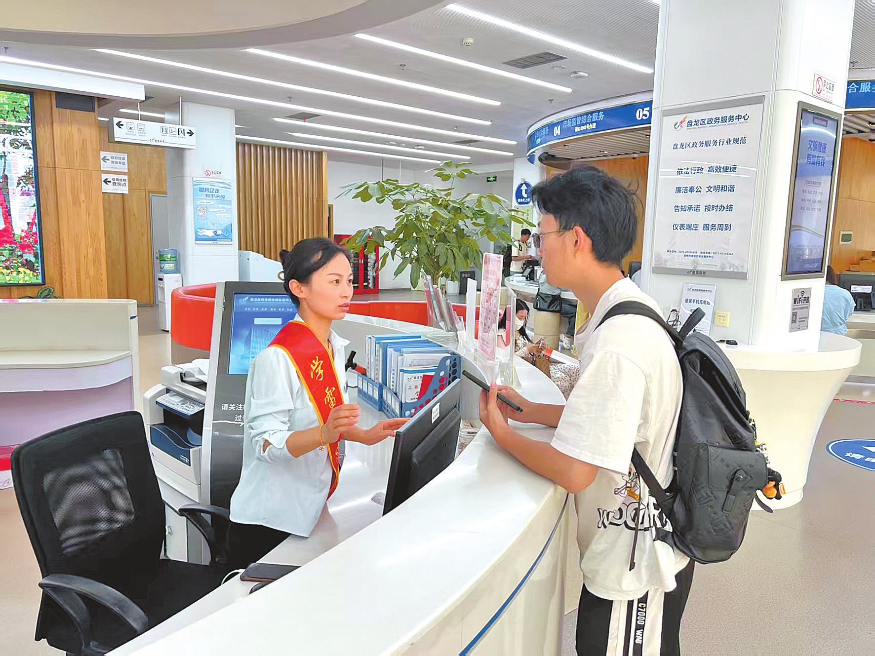 盘龙区将导办服务从指路答疑升级为全链护航,打造集咨询引导、预审取号、自助辅导、帮办代办于一体的综合服务模式。依托材料预审机制,将材料不全、材料有误的痛点化解于受理窗口之外。市场监管和社保医保片区配备自助专区辅导员,指导企业群众自助填报相关信息,减少群众等待时间,降低窗口拥堵率,将群众办事“一次过”比例提升至95%,窗口办事效率大幅提升,服务大厅从“人声鼎沸”转向有序高效。