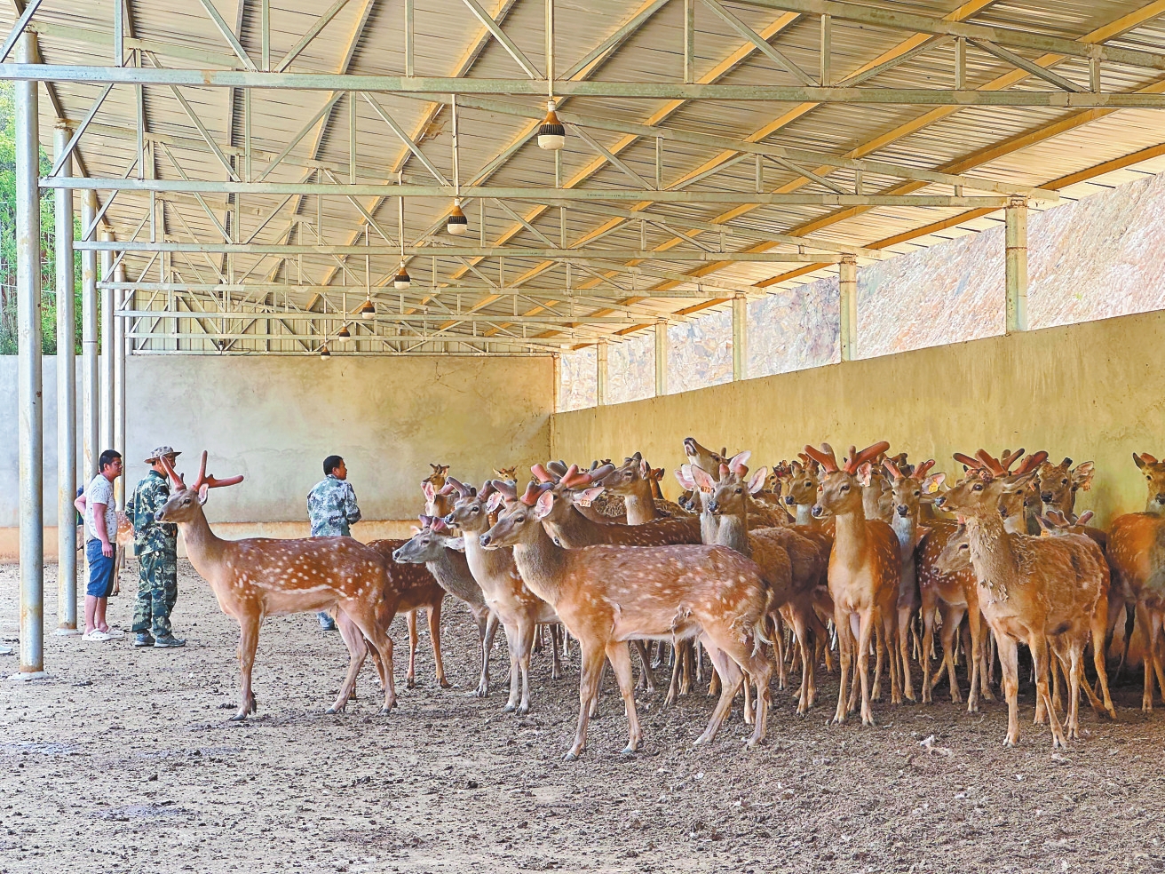 甸苴社区梅花鹿养殖基地所在的祭龙处象鼻山林地丰富,环境清幽。此前这里是一片闲置的山地,为破解产业基础薄弱的发展难题,2022年5月,甸苴社区成立玉溪甸苴农业发展有限公司,通过银行贷款50万元改造养殖场,并于2023年初引进21头梅花鹿养殖,迈出产业转型第一步。此后,社区又两次通过银行贷款、争取乡村振兴补助资金等方式,扩大养殖基地规模,引进更多梅花鹿饲养。目前,基地存栏110头梅花鹿,形成养殖区、展示区、放养区和鹿产品加工区的综合布局。