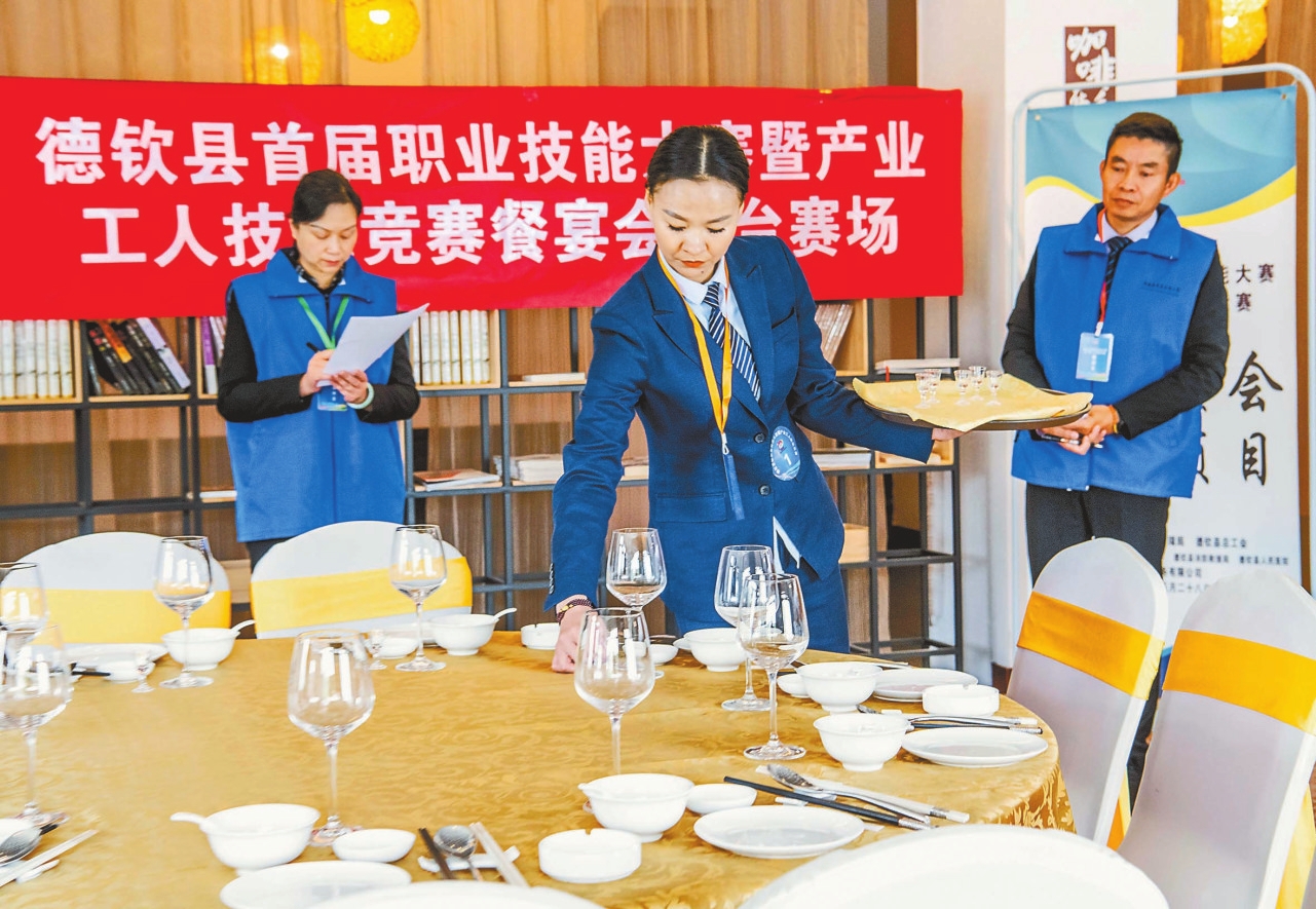近日,德钦县首届职业技能大赛暨产业工人技能竞赛落幕。来自全县企事业单位、个体从业者等60余名选手参加动物疫病检疫、护理技能、中式烹调师、中餐宴会摆台、客房服务、摄影师、灭火救援员、消防装备维护员8个项目的竞赛,一、二、三等奖获奖选手将被优先推荐参加州级、省级技能竞赛。图为中餐宴会摆台技能竞赛现场。本报通讯员 刘建明 春英 摄
