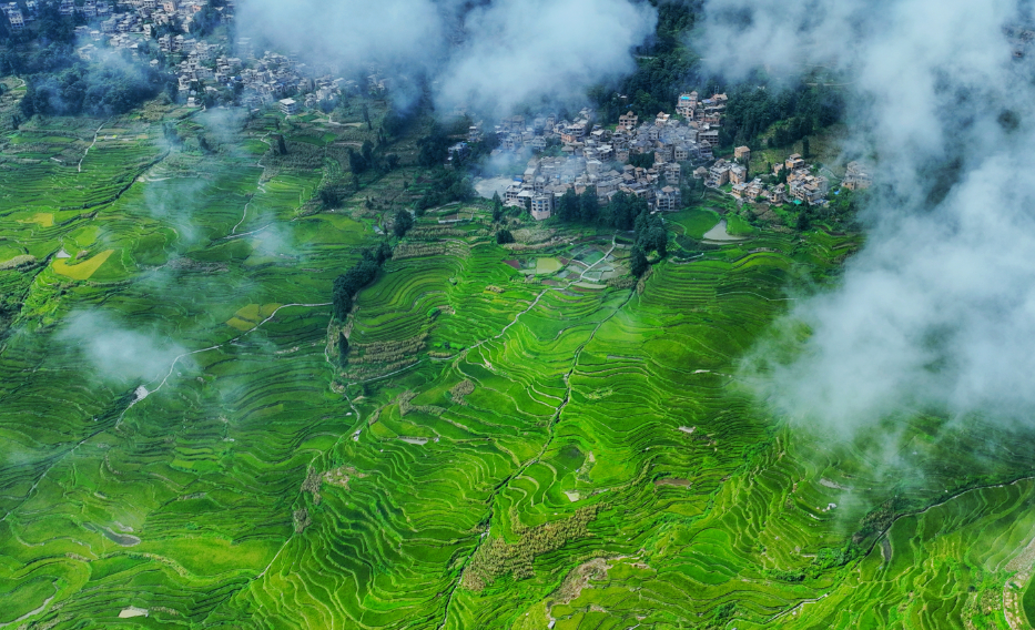晨雾初散,老虎嘴梯田的轮廓更加清晰,嫩绿的禾苗随风摇曳、拔节生长。