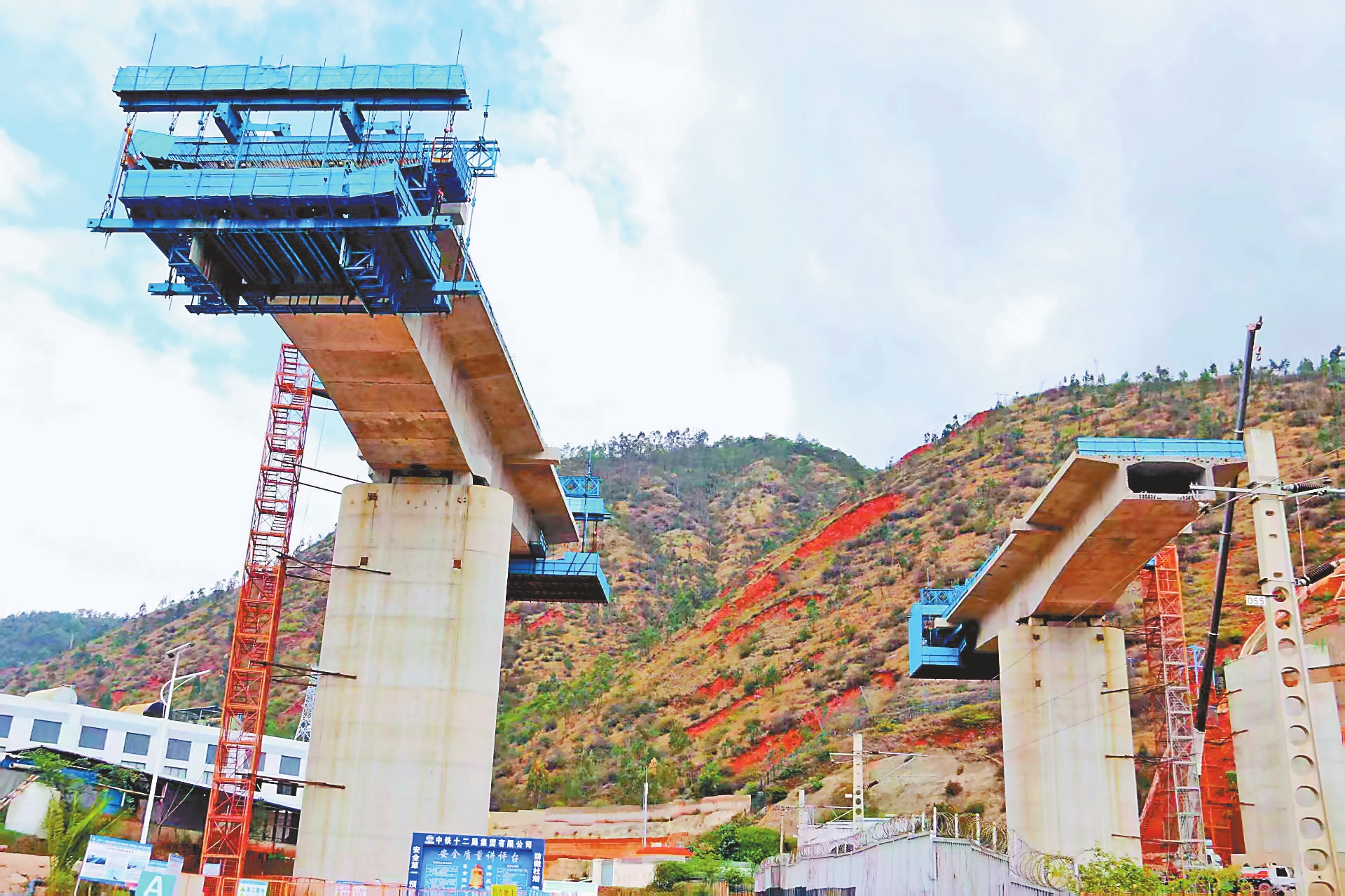 凤仪镇双线特大桥位于大理市。此次转体的跨昆楚大铁路连续梁,长度达121米,双墩转体重量超过万吨,采用中心承重转体方式。转体作业在运营铁路线的检修“天窗期”进行。当天凌晨零点,在既有铁路线两侧的两段转体大桥开始同步顺时针转动55度。凌晨两点,两段桥面精准对接,转体顺利完成。