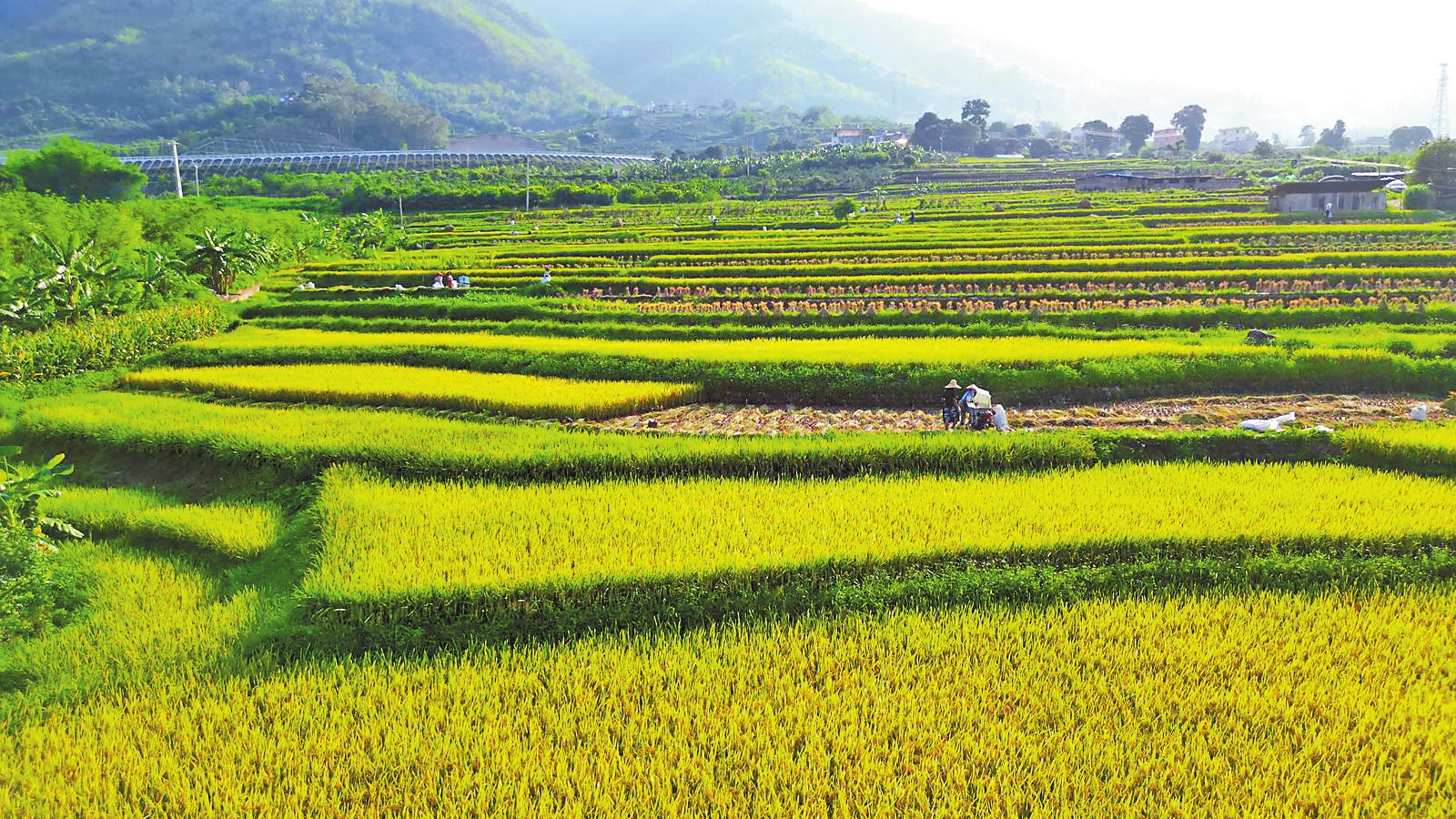 近日,新平彝族傣族自治县河谷地区迎来早稻丰收季。在戛洒镇大田新村的田野里,连片的金黄稻穗随风摇曳,收割机轰鸣作响,稻农们抢抓好天气收割稻谷。近年来,新平县通过推广机械化收割、优化种植结构、引进优质稻种等举措,不断提升农业生产效率。本报记者 王剑钊 通讯员 饶菠 李艺宾 摄