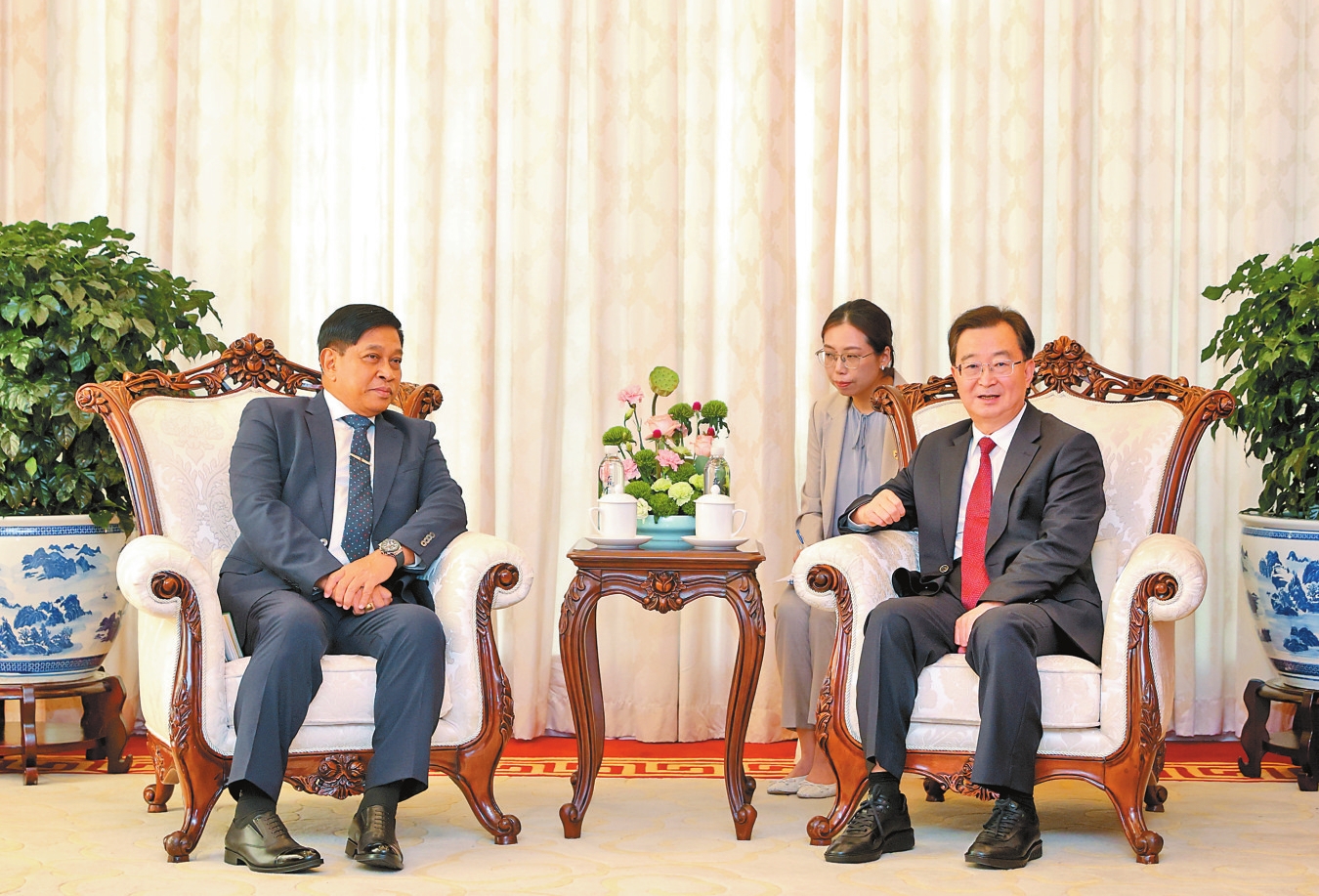 6月18日,省委书记王宁在昆明会见来滇出席第9届南博会暨第29届昆交会的缅甸副总理兼总理府部长丁昂山一行。本报记者 周灿 摄