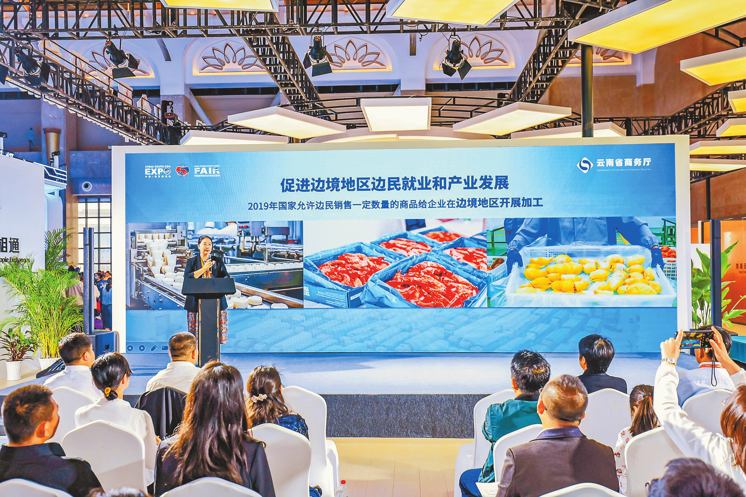 现场,省商务厅相关负责人围绕边民互市进口商品落地加工、管理要求及产业发展、通关便利化、税收优惠等政策进行推介。来自昆明市、德宏傣族景颇族自治州、红河哈尼族彝族自治州、西双版纳傣族自治州、普洱市、临沧市、保山市、文山壮族苗族自治州8个边境州(市)12个边境县(市、区)和产业园区代表,围绕水产品加工、特色农产品、中药材、药食同源产品等领域项目进行推介。来自北京、四川及省内120余位企业家代表参会交流。